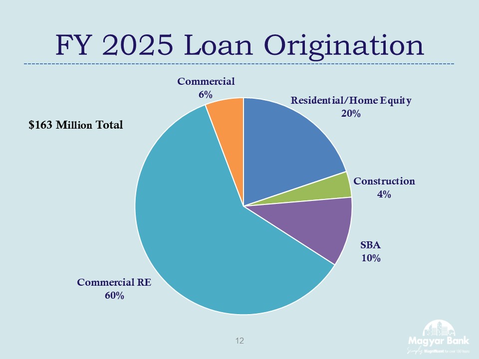 FY 2025 Loan Origination Residential/Home Equity 20% Construction 4% SBA 10% Commercial RE 60% Commercial 6% 12 $163 M illion Total