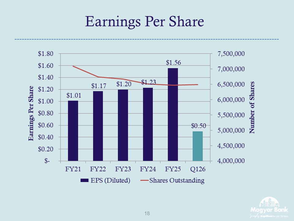 Net Income 17 $6,120 $7,919 $7,709 $7,783 $9,760 $3,136 $0 $2,000 $4,000 $6,000 $8,000 $10,000 $12,000 FY21 FY22 FY23 FY24 FY25 Q126 Dollars in Thousands