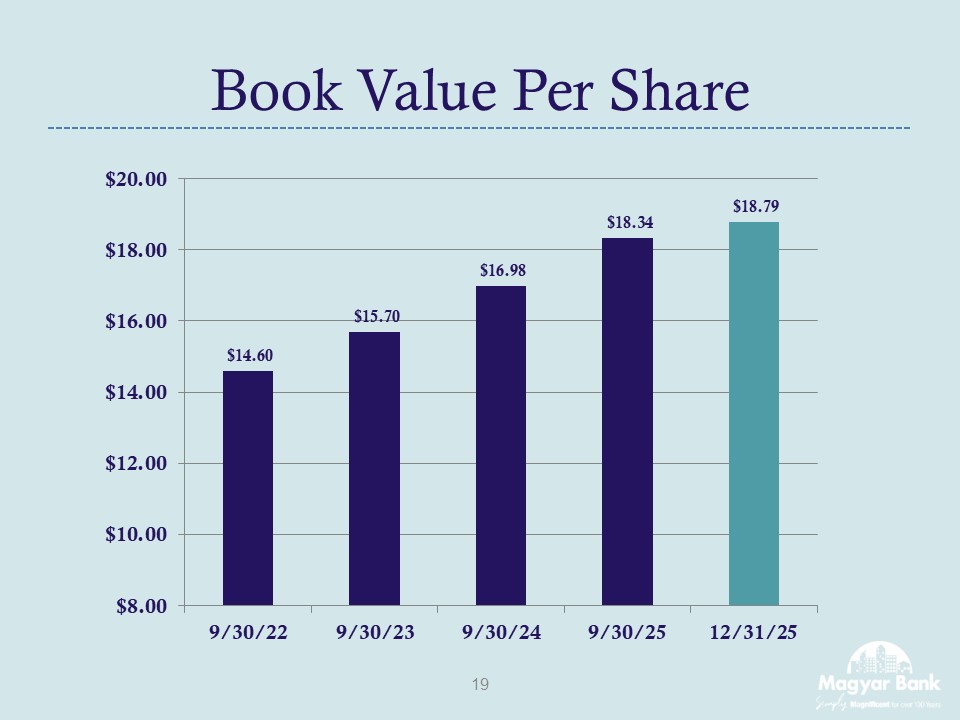 Book Value Per Share 19 $14.60 $15.70 $16.98 $18.34 $18.79 $8.00 $10.00 $12.00 $14.00 $16.00 $18.00 $20.00 9/30/22 9/30/23 9/30/24 9/30/25 12/31/25