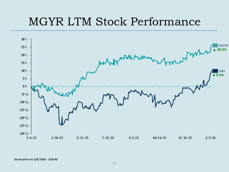 MGYR LTM Stock Performance 21 KRX MGYR Stock price on 2/6/2026 - $18.40 26. 3 % 9.9 % (30%) (25%) (20%) (15%) (10%) (5%) 0% 5% 10% 15% 20% 25% 30% 2/6/25 3/30/25 5/21/25 7/12/25 9/2/25 10/24/25 12/15/25 2/5/26