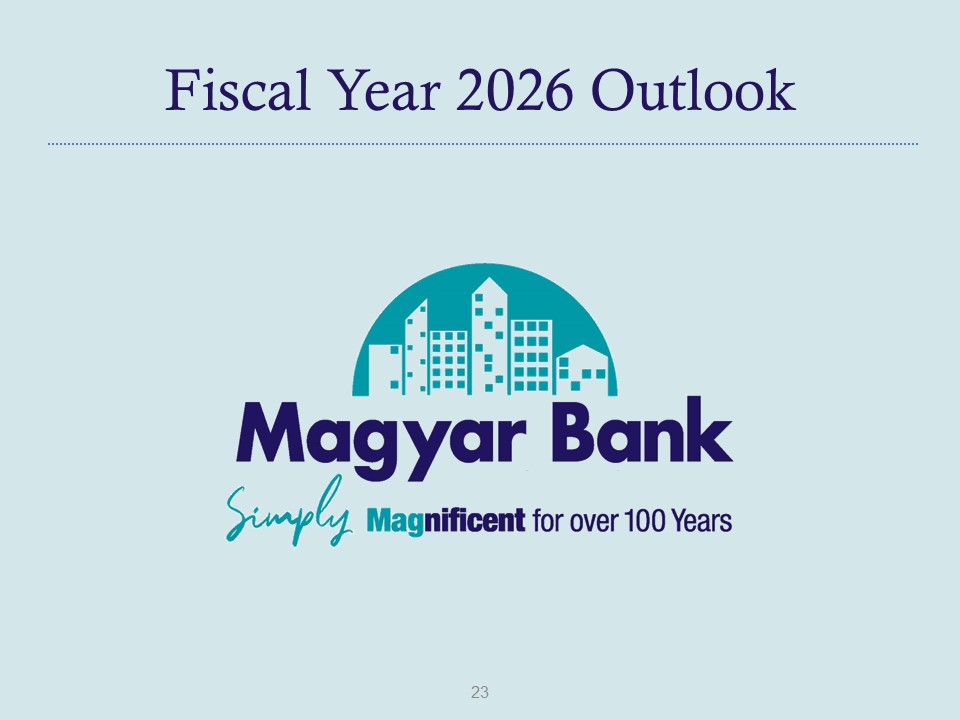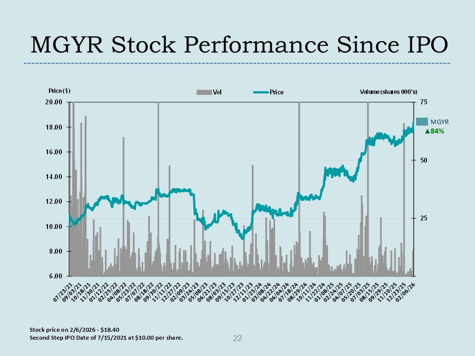 MGYR Stock Performance Since IPO 22 MGYR Stock price on 2/6/2026 - $18.40 Second Step IPO Date of 7/15/2021 at $10.00 per share. 84 % 6.00 8.00 10.00 12.00 14.00 16.00 18.00 20.00 25 50 75 Price ($) Volume (shares 000's) Vol Price