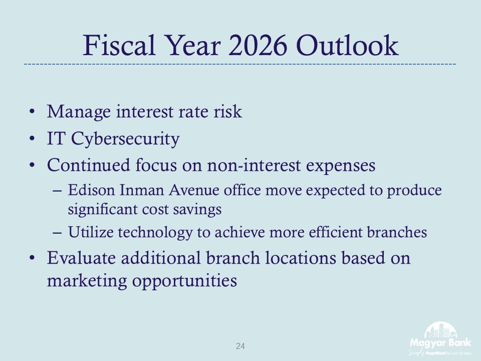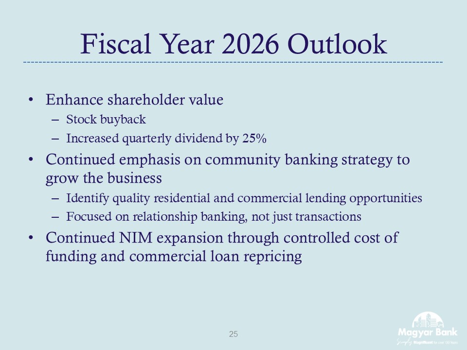 Fiscal Year 2026 Outlook • Manage interest rate risk • IT Cybersecurity • Continued focus on non - interest expenses – Edison Inman Avenue office move expected to produce significant cost savings – Utilize technology to achieve more efficient branches • Evaluate additional branch locations based on marketing opportunities 24