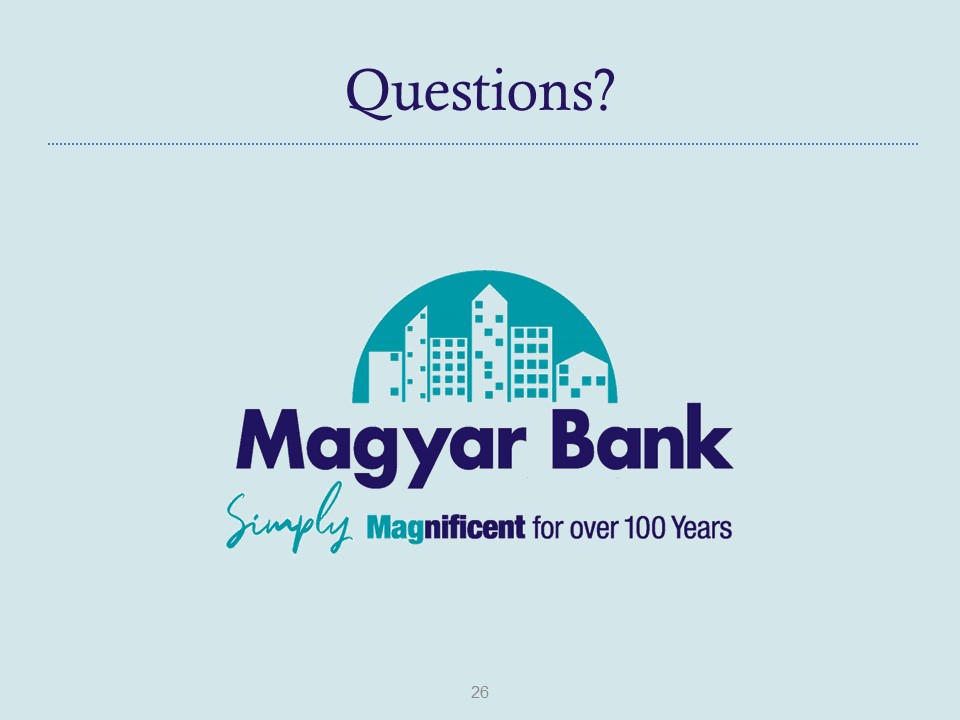 Fiscal Year 2026 Outlook • Enhance shareholder value – Stock buyback – Increased quarterly dividend by 25% • Continued emphasis on community banking strategy to grow the business – Identify quality residential and commercial lending opportunities – Focused on relationship banking, not just transactions • Continued NIM expansion through controlled cost of funding and commercial loan repricing 25