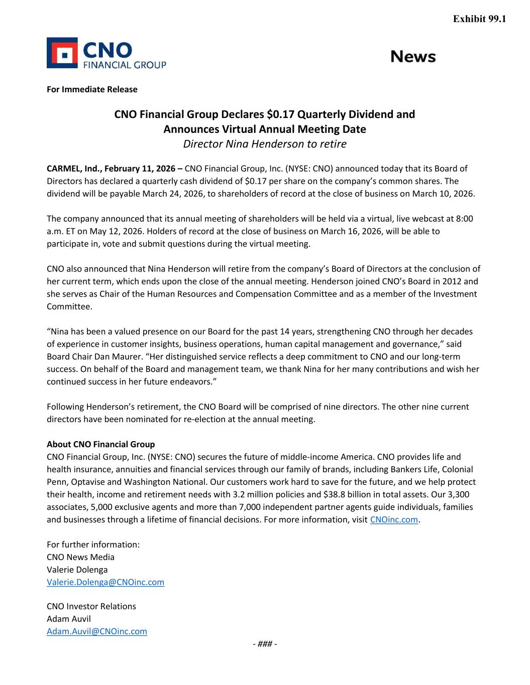 Exhibit 99.1 For Immediate Release CNO Financial Group Declares $0.17 Quarterly Dividend and Announces Virtual Annual Meeting Date Director Nina Henderson to retire CARMEL, Ind., February 11, 2026 – CNO Financial Group, Inc. (NYSE: CNO) announced today that its Board of Directors has declared a quarterly cash dividend of $0.17 per share on the company’s common shares. The dividend will be payable March 24, 2026, to shareholders of record at the close of business on March 10, 2026. The company announced that its annual meeting of shareholders will be held via a virtual, live webcast at 8:00 a.m. ET on May 12, 2026. Holders of record at the close of business on March 16, 2026, will be able to participate in, vote and submit questions during the virtual meeting. CNO also announced that Nina Henderson will retire from the company’s Board of Directors at the conclusion of her current term, which ends upon the close of the annual meeting. Henderson joined CNO’s Board in 2012 and she serves as Chair of the Human Resources and Compensation Committee and as a member of the Investment Committee. “Nina has been a valued presence on our Board for the past 14 years, strengthening CNO through her decades of experience in customer insights, business operations, human capital management and governance,” said Board Chair Dan Maurer. “Her distinguished service reflects a deep commitment to CNO and our long-term success. On behalf of the Board and management team, we thank Nina for her many contributions and wish her continued success in her future endeavors.” Following Henderson’s retirement, the CNO Board will be comprised of nine directors. The other nine current directors have been nominated for re-election at the annual meeting. About CNO Financial Group CNO Financial Group, Inc. (NYSE: CNO) secures the future of middle-income America. CNO provides life and health insurance, annuities and financial services through our family of brands, including Bankers Life, Colonial Penn, Optavise and Washington National. Our customers work hard to save for the future, and we help protect their health, income and retirement needs with 3.2 million policies and $38.8 billion in total assets. Our 3,300 associates, 5,000 exclusive agents and more than 7,000 independent partner agents guide individuals, families and businesses through a lifetime of financial decisions. For more information, visit CNOinc.com. For further information: CNO News Media Valerie Dolenga Valerie.Dolenga@CNOinc.com CNO Investor Relations Adam Auvil Adam.Auvil@CNOinc.com - ### -