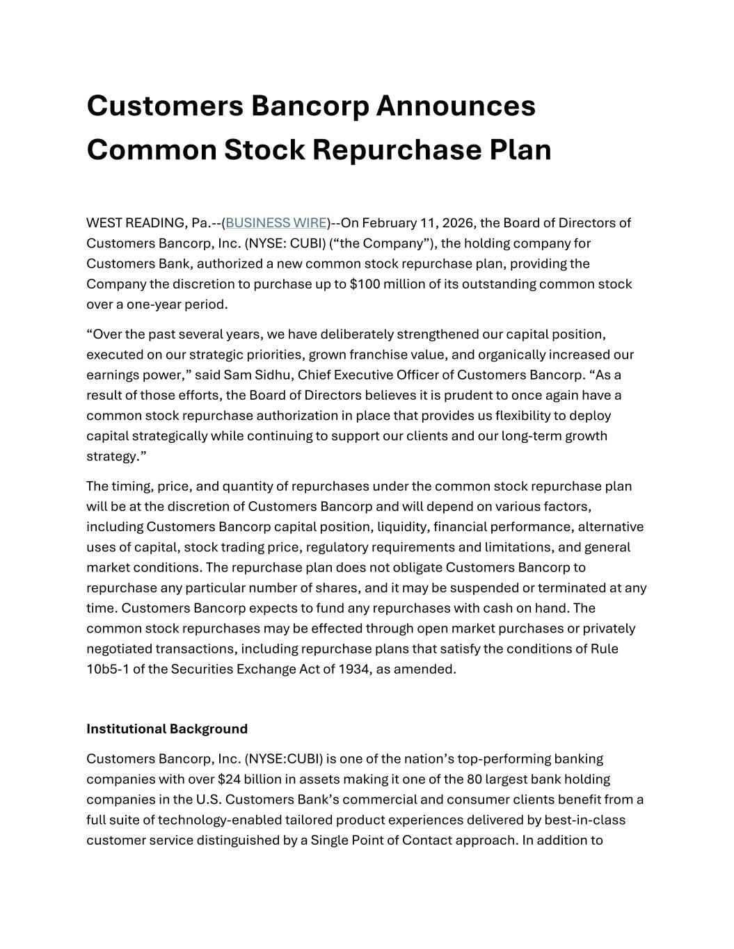 Customers Bancorp Announces Common Stock Repurchase Plan WEST READING, Pa.--(BUSINESS WIRE)--On February 11, 2026, the Board of Directors of Customers Bancorp, Inc. (NYSE: CUBI) (“the Company”), the holding company for Customers Bank, authorized a new common stock repurchase plan, providing the Company the discretion to purchase up to $100 million of its outstanding common stock over a one-year period. “Over the past several years, we have deliberately strengthened our capital position, executed on our strategic priorities, grown franchise value, and organically increased our earnings power,” said Sam Sidhu, Chief Executive Officer of Customers Bancorp. “As a result of those efforts, the Board of Directors believes it is prudent to once again have a common stock repurchase authorization in place that provides us flexibility to deploy capital strategically while continuing to support our clients and our long-term growth strategy.” The timing, price, and quantity of repurchases under the common stock repurchase plan will be at the discretion of Customers Bancorp and will depend on various factors, including Customers Bancorp capital position, liquidity, financial performance, alternative uses of capital, stock trading price, regulatory requirements and limitations, and general market conditions. The repurchase plan does not obligate Customers Bancorp to repurchase any particular number of shares, and it may be suspended or terminated at any time. Customers Bancorp expects to fund any repurchases with cash on hand. The common stock repurchases may be effected through open market purchases or privately negotiated transactions, including repurchase plans that satisfy the conditions of Rule 10b5-1 of the Securities Exchange Act of 1934, as amended. Institutional Background Customers Bancorp, Inc. (NYSE:CUBI) is one of the nation’s top-performing banking companies with over $24 billion in assets making it one of the 80 largest bank holding companies in the U.S. Customers Bank’s commercial and consumer clients benefit from a full suite of technology-enabled tailored product experiences delivered by best-in-class customer service distinguished by a Single Point of Contact approach. In addition to