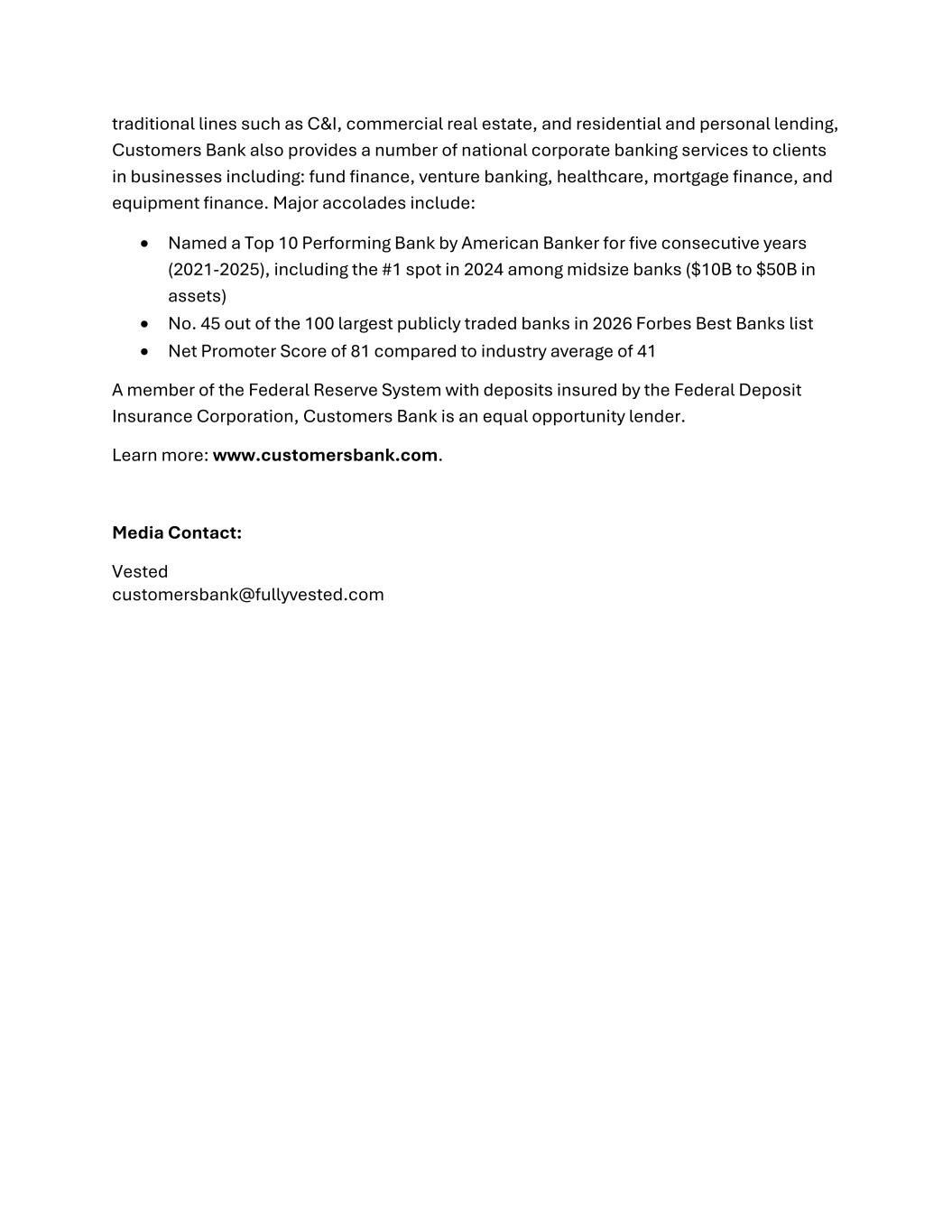 traditional lines such as C&I, commercial real estate, and residential and personal lending, Customers Bank also provides a number of national corporate banking services to clients in businesses including: fund finance, venture banking, healthcare, mortgage finance, and equipment finance. Major accolades include: • Named a Top 10 Performing Bank by American Banker for five consecutive years (2021-2025), including the #1 spot in 2024 among midsize banks ($10B to $50B in assets) • No. 45 out of the 100 largest publicly traded banks in 2026 Forbes Best Banks list • Net Promoter Score of 81 compared to industry average of 41 A member of the Federal Reserve System with deposits insured by the Federal Deposit Insurance Corporation, Customers Bank is an equal opportunity lender. Learn more: www.customersbank.com. Media Contact: Vested customersbank@fullyvested.com