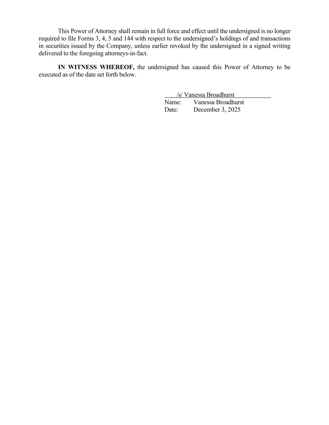 This Power of Attorney shall remain in full force and effect until the undersigned is no longer required to file Forms 3, 4, 5 and 144 with respect to the undersigned’s holdings of and transactions in securities issued by the Company, unless earlier revoked by the undersigned in a signed writing delivered to the foregoing attorneys-in-fact. IN WITNESS WHEREOF, the undersigned has caused this Power of Attorney to be executed as of the date set forth below. /s/ Vanessa Broadhurst Name: Vanessa Broadhurst Date: December 3, 2025