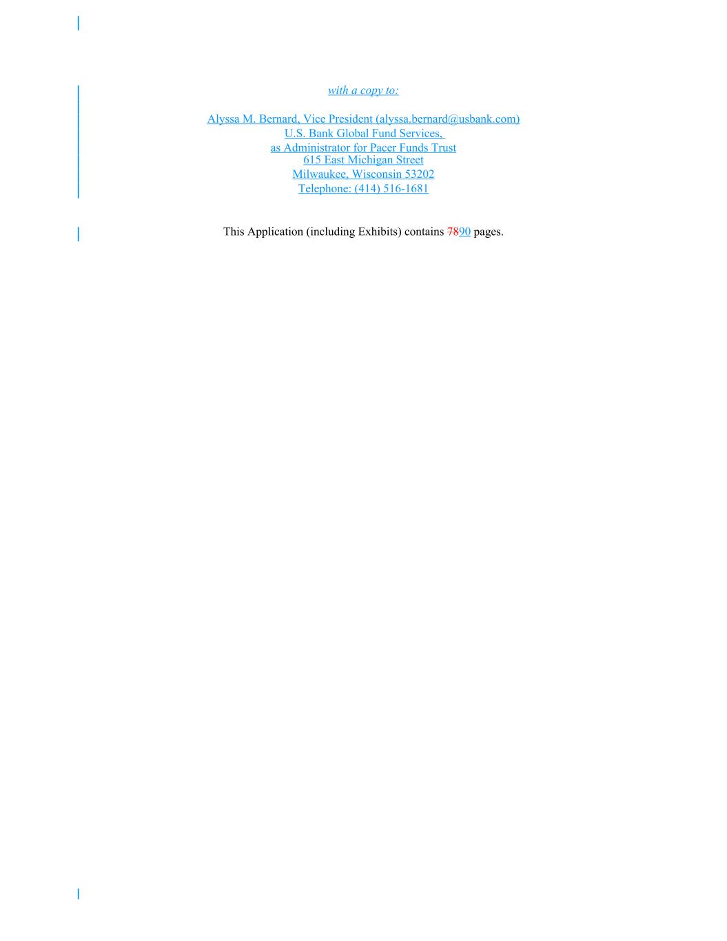 with a copy to: Alyssa M. Bernard, Vice President (alyssa.bernard@usbank.com) U.S. Bank Global Fund Services, as Administrator for Pacer Funds Trust 615 East Michigan Street Milwaukee, Wisconsin 53202 Telephone: (414) 516-1681 This Application (including Exhibits) contains 7890 pages.