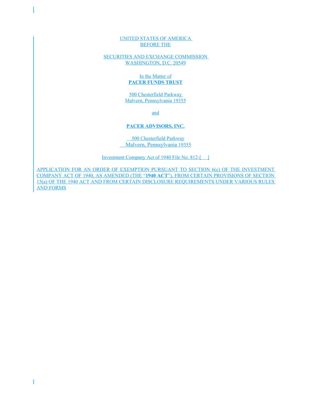 UNITED STATES OF AMERICA BEFORE THE SECURITIES AND EXCHANGE COMMISSION WASHINGTON, D.C. 20549 In the Matter of PACER FUNDS TRUST 500 Chesterfield Parkway Malvern, Pennsylvania 19355 and PACER ADVISORS, INC. 500 Chesterfield Parkway Malvern, Pennsylvania 19355 Investment Company Act of 1940 File No. 812-[ ] APPLICATION FOR AN ORDER OF EXEMPTION PURSUANT TO SECTION 6(c) OF THE INVESTMENT COMPANY ACT OF 1940, AS AMENDED (THE “1940 ACT”), FROM CERTAIN PROVISIONS OF SECTION 15(a) OF THE 1940 ACT AND FROM CERTAIN DISCLOSURE REQUIREMENTS UNDER VARIOUS RULES AND FORMS