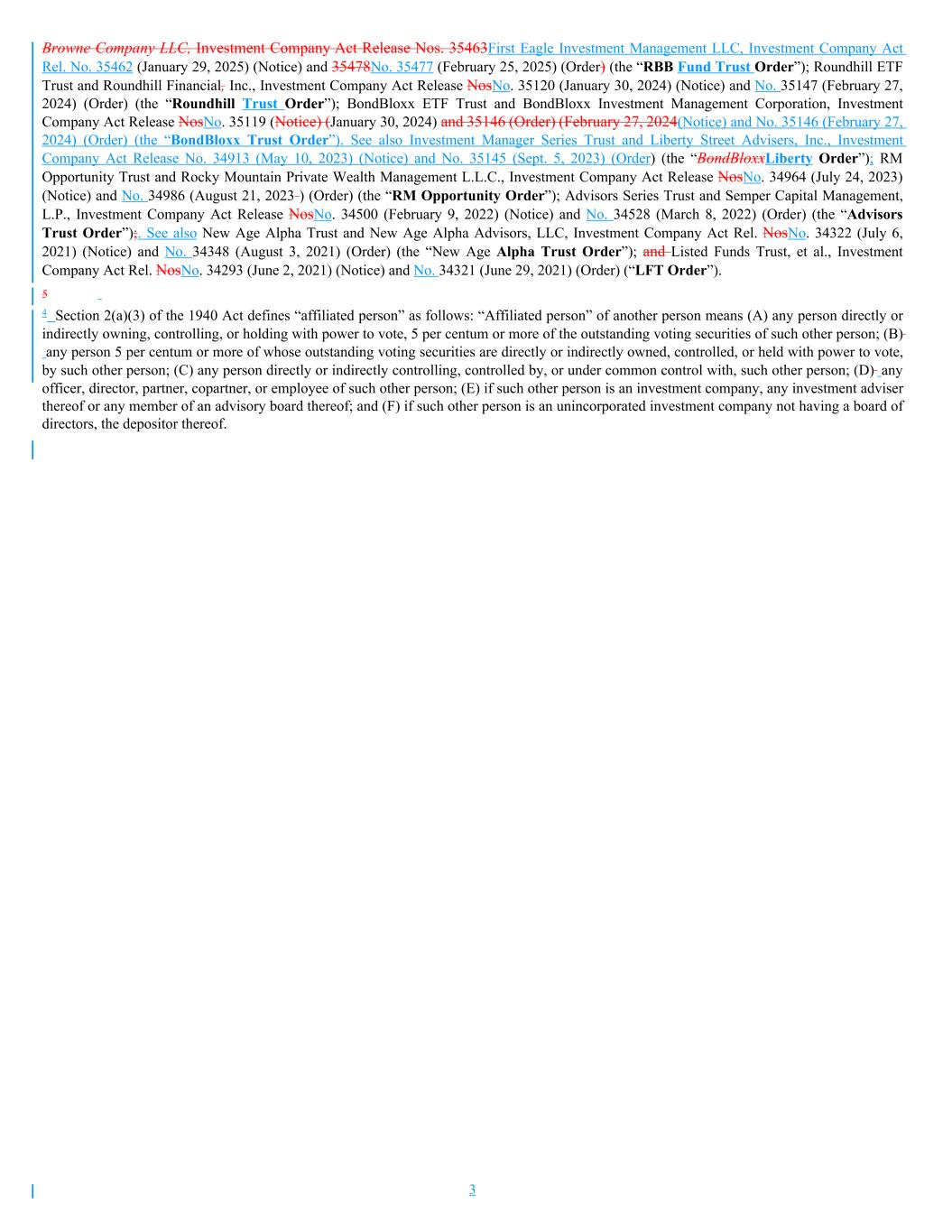 Browne Company LLC, Investment Company Act Release Nos. 35463First Eagle Investment Management LLC, Investment Company Act Rel. No. 35462 (January 29, 2025) (Notice) and 35478No. 35477 (February 25, 2025) (Order) (the “RBB Fund Trust Order”); Roundhill ETF Trust and Roundhill Financial, Inc., Investment Company Act Release NosNo. 35120 (January 30, 2024) (Notice) and No. 35147 (February 27, 2024) (Order) (the “Roundhill Trust Order”); BondBloxx ETF Trust and BondBloxx Investment Management Corporation, Investment Company Act Release NosNo. 35119 (Notice) (January 30, 2024) and 35146 (Order) (February 27, 2024(Notice) and No. 35146 (February 27, 2024) (Order) (the “BondBloxx Trust Order”). See also Investment Manager Series Trust and Liberty Street Advisers, Inc., Investment Company Act Release No. 34913 (May 10, 2023) (Notice) and No. 35145 (Sept. 5, 2023) (Order) (the “BondBloxxLiberty Order”); RM Opportunity Trust and Rocky Mountain Private Wealth Management L.L.C., Investment Company Act Release NosNo. 34964 (July 24, 2023) (Notice) and No. 34986 (August 21, 2023 ) (Order) (the “RM Opportunity Order”); Advisors Series Trust and Semper Capital Management, L.P., Investment Company Act Release NosNo. 34500 (February 9, 2022) (Notice) and No. 34528 (March 8, 2022) (Order) (the “Advisors Trust Order”);. See also New Age Alpha Trust and New Age Alpha Advisors, LLC, Investment Company Act Rel. NosNo. 34322 (July 6, 2021) (Notice) and No. 34348 (August 3, 2021) (Order) (the “New Age Alpha Trust Order”); and Listed Funds Trust, et al., Investment Company Act Rel. NosNo. 34293 (June 2, 2021) (Notice) and No. 34321 (June 29, 2021) (Order) (“LFT Order”). 5 4 Section 2(a)(3) of the 1940 Act defines “affiliated person” as follows: “Affiliated person” of another person means (A) any person directly or indirectly owning, controlling, or holding with power to vote, 5 per centum or more of the outstanding voting securities of such other person; (B) any person 5 per centum or more of whose outstanding voting securities are directly or indirectly owned, controlled, or held with power to vote, by such other person; (C) any person directly or indirectly controlling, controlled by, or under common control with, such other person; (D) any officer, director, partner, copartner, or employee of such other person; (E) if such other person is an investment company, any investment adviser thereof or any member of an advisory board thereof; and (F) if such other person is an unincorporated investment company not having a board of directors, the depositor thereof. 3