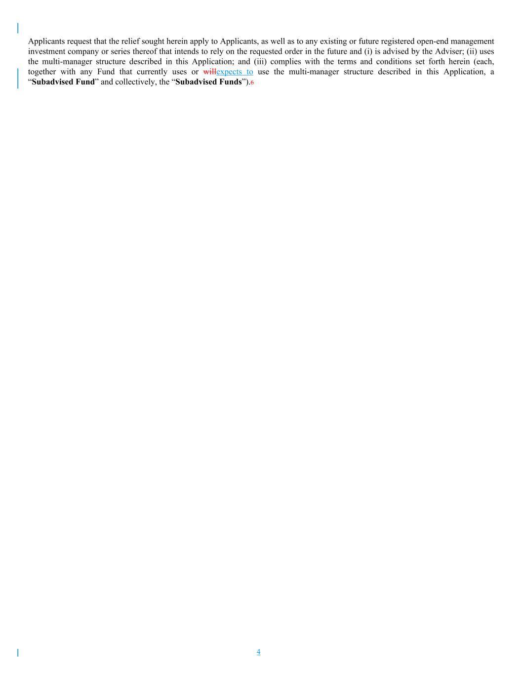 Applicants request that the relief sought herein apply to Applicants, as well as to any existing or future registered open-end management investment company or series thereof that intends to rely on the requested order in the future and (i) is advised by the Adviser; (ii) uses the multi-manager structure described in this Application; and (iii) complies with the terms and conditions set forth herein (each, together with any Fund that currently uses or willexpects to use the multi-manager structure described in this Application, a “Subadvised Fund” and collectively, the “Subadvised Funds”).6 4