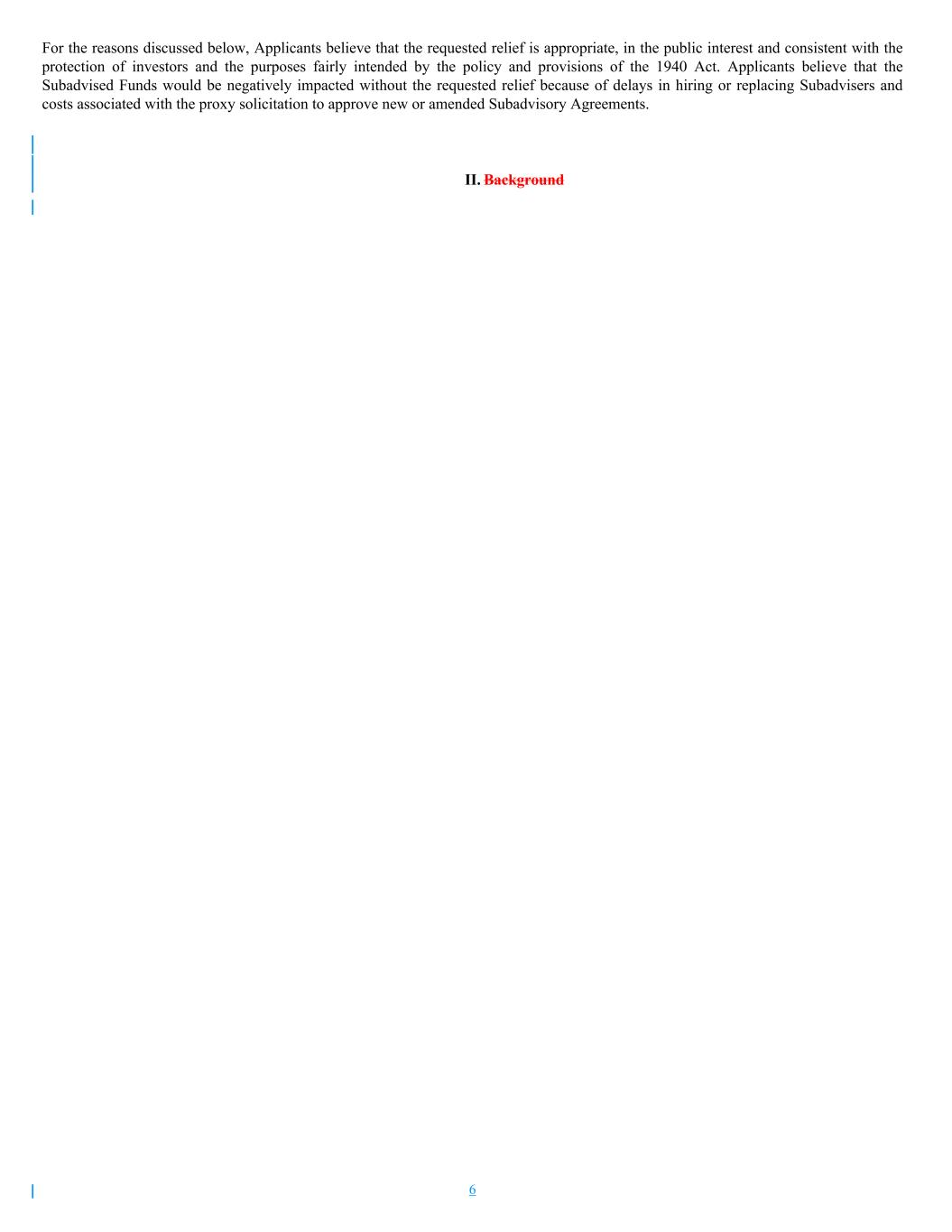 For the reasons discussed below, Applicants believe that the requested relief is appropriate, in the public interest and consistent with the protection of investors and the purposes fairly intended by the policy and provisions of the 1940 Act. Applicants believe that the Subadvised Funds would be negatively impacted without the requested relief because of delays in hiring or replacing Subadvisers and costs associated with the proxy solicitation to approve new or amended Subadvisory Agreements. II. Background 6