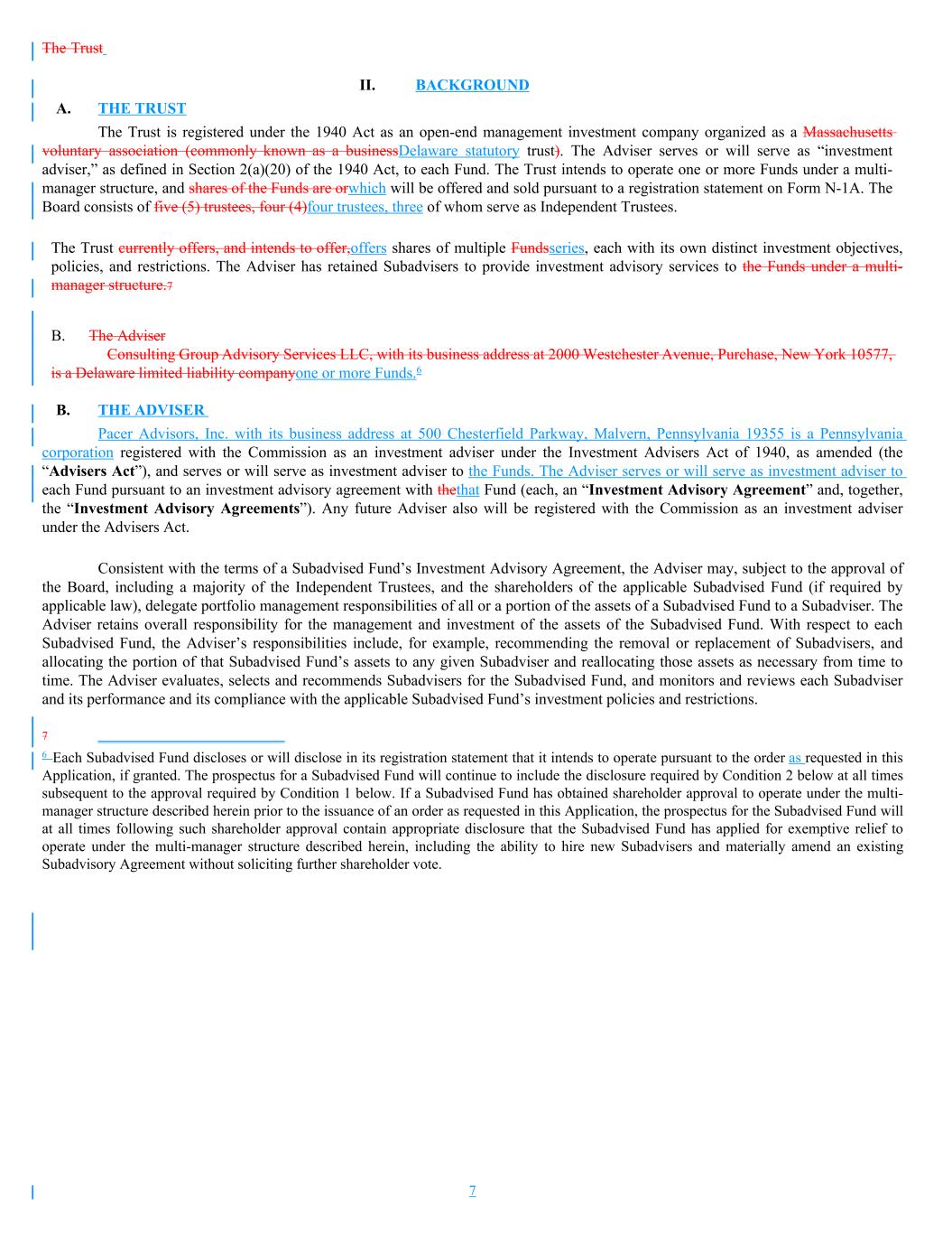 The Trust II. BACKGROUND A. THE TRUST The Trust is registered under the 1940 Act as an open-end management investment company organized as a Massachusetts voluntary association (commonly known as a businessDelaware statutory trust). The Adviser serves or will serve as “investment adviser,” as defined in Section 2(a)(20) of the 1940 Act, to each Fund. The Trust intends to operate one or more Funds under a multi- manager structure, and shares of the Funds are orwhich will be offered and sold pursuant to a registration statement on Form N-1A. The Board consists of five (5) trustees, four (4)four trustees, three of whom serve as Independent Trustees. The Trust currently offers, and intends to offer,offers shares of multiple Fundsseries, each with its own distinct investment objectives, policies, and restrictions. The Adviser has retained Subadvisers to provide investment advisory services to the Funds under a multi- manager structure.7 B. The Adviser Consulting Group Advisory Services LLC, with its business address at 2000 Westchester Avenue, Purchase, New York 10577, is a Delaware limited liability companyone or more Funds.6 B. THE ADVISER Pacer Advisors, Inc. with its business address at 500 Chesterfield Parkway, Malvern, Pennsylvania 19355 is a Pennsylvania corporation registered with the Commission as an investment adviser under the Investment Advisers Act of 1940, as amended (the “Advisers Act”), and serves or will serve as investment adviser to the Funds. The Adviser serves or will serve as investment adviser to each Fund pursuant to an investment advisory agreement with thethat Fund (each, an “Investment Advisory Agreement” and, together, the “Investment Advisory Agreements”). Any future Adviser also will be registered with the Commission as an investment adviser under the Advisers Act. Consistent with the terms of a Subadvised Fund’s Investment Advisory Agreement, the Adviser may, subject to the approval of the Board, including a majority of the Independent Trustees, and the shareholders of the applicable Subadvised Fund (if required by applicable law), delegate portfolio management responsibilities of all or a portion of the assets of a Subadvised Fund to a Subadviser. The Adviser retains overall responsibility for the management and investment of the assets of the Subadvised Fund. With respect to each Subadvised Fund, the Adviser’s responsibilities include, for example, recommending the removal or replacement of Subadvisers, and allocating the portion of that Subadvised Fund’s assets to any given Subadviser and reallocating those assets as necessary from time to time. The Adviser evaluates, selects and recommends Subadvisers for the Subadvised Fund, and monitors and reviews each Subadviser and its performance and its compliance with the applicable Subadvised Fund’s investment policies and restrictions. 7 ________________________ 6 Each Subadvised Fund discloses or will disclose in its registration statement that it intends to operate pursuant to the order as requested in this Application, if granted. The prospectus for a Subadvised Fund will continue to include the disclosure required by Condition 2 below at all times subsequent to the approval required by Condition 1 below. If a Subadvised Fund has obtained shareholder approval to operate under the multi- manager structure described herein prior to the issuance of an order as requested in this Application, the prospectus for the Subadvised Fund will at all times following such shareholder approval contain appropriate disclosure that the Subadvised Fund has applied for exemptive relief to operate under the multi-manager structure described herein, including the ability to hire new Subadvisers and materially amend an existing Subadvisory Agreement without soliciting further shareholder vote. 7