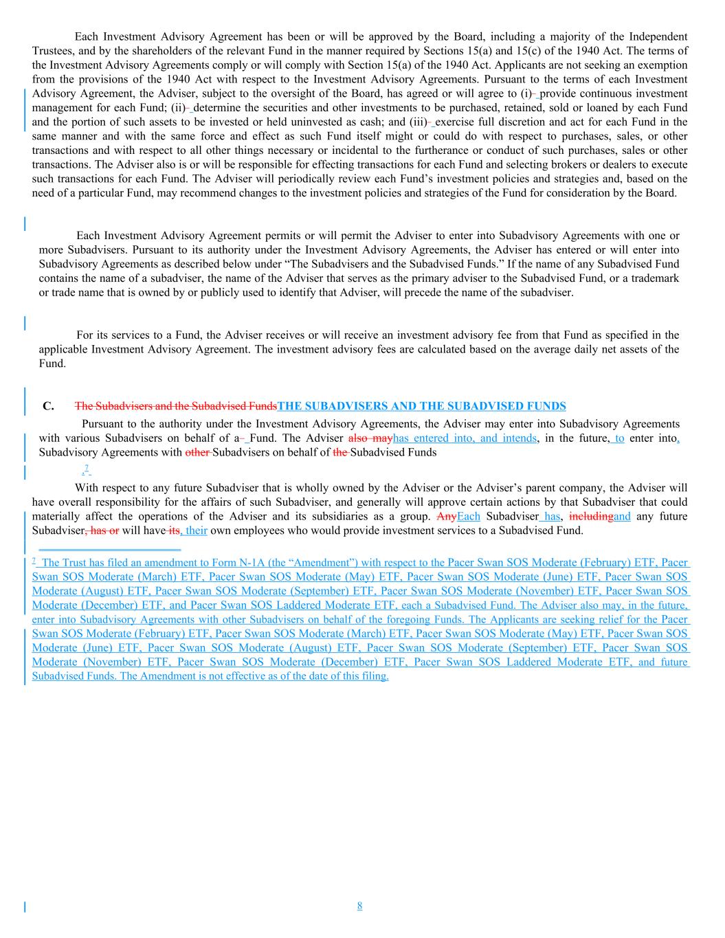 Each Investment Advisory Agreement has been or will be approved by the Board, including a majority of the Independent Trustees, and by the shareholders of the relevant Fund in the manner required by Sections 15(a) and 15(c) of the 1940 Act. The terms of the Investment Advisory Agreements comply or will comply with Section 15(a) of the 1940 Act. Applicants are not seeking an exemption from the provisions of the 1940 Act with respect to the Investment Advisory Agreements. Pursuant to the terms of each Investment Advisory Agreement, the Adviser, subject to the oversight of the Board, has agreed or will agree to (i) provide continuous investment management for each Fund; (ii) determine the securities and other investments to be purchased, retained, sold or loaned by each Fund and the portion of such assets to be invested or held uninvested as cash; and (iii) exercise full discretion and act for each Fund in the same manner and with the same force and effect as such Fund itself might or could do with respect to purchases, sales, or other transactions and with respect to all other things necessary or incidental to the furtherance or conduct of such purchases, sales or other transactions. The Adviser also is or will be responsible for effecting transactions for each Fund and selecting brokers or dealers to execute such transactions for each Fund. The Adviser will periodically review each Fund’s investment policies and strategies and, based on the need of a particular Fund, may recommend changes to the investment policies and strategies of the Fund for consideration by the Board. Each Investment Advisory Agreement permits or will permit the Adviser to enter into Subadvisory Agreements with one or more Subadvisers. Pursuant to its authority under the Investment Advisory Agreements, the Adviser has entered or will enter into Subadvisory Agreements as described below under “The Subadvisers and the Subadvised Funds.” If the name of any Subadvised Fund contains the name of a subadviser, the name of the Adviser that serves as the primary adviser to the Subadvised Fund, or a trademark or trade name that is owned by or publicly used to identify that Adviser, will precede the name of the subadviser. For its services to a Fund, the Adviser receives or will receive an investment advisory fee from that Fund as specified in the applicable Investment Advisory Agreement. The investment advisory fees are calculated based on the average daily net assets of the Fund. C. The Subadvisers and the Subadvised FundsTHE SUBADVISERS AND THE SUBADVISED FUNDS Pursuant to the authority under the Investment Advisory Agreements, the Adviser may enter into Subadvisory Agreements with various Subadvisers on behalf of a Fund. The Adviser also mayhas entered into, and intends, in the future, to enter into, Subadvisory Agreements with other Subadvisers on behalf of the Subadvised Funds .7 With respect to any future Subadviser that is wholly owned by the Adviser or the Adviser’s parent company, the Adviser will have overall responsibility for the affairs of such Subadviser, and generally will approve certain actions by that Subadviser that could materially affect the operations of the Adviser and its subsidiaries as a group. AnyEach Subadviser has, includingand any future Subadviser, has or will have its, their own employees who would provide investment services to a Subadvised Fund. ________________________ 7 The Trust has filed an amendment to Form N-1A (the “Amendment”) with respect to the Pacer Swan SOS Moderate (February) ETF, Pacer Swan SOS Moderate (March) ETF, Pacer Swan SOS Moderate (May) ETF, Pacer Swan SOS Moderate (June) ETF, Pacer Swan SOS Moderate (August) ETF, Pacer Swan SOS Moderate (September) ETF, Pacer Swan SOS Moderate (November) ETF, Pacer Swan SOS Moderate (December) ETF, and Pacer Swan SOS Laddered Moderate ETF, each a Subadvised Fund. The Adviser also may, in the future, enter into Subadvisory Agreements with other Subadvisers on behalf of the foregoing Funds. The Applicants are seeking relief for the Pacer Swan SOS Moderate (February) ETF, Pacer Swan SOS Moderate (March) ETF, Pacer Swan SOS Moderate (May) ETF, Pacer Swan SOS Moderate (June) ETF, Pacer Swan SOS Moderate (August) ETF, Pacer Swan SOS Moderate (September) ETF, Pacer Swan SOS Moderate (November) ETF, Pacer Swan SOS Moderate (December) ETF, Pacer Swan SOS Laddered Moderate ETF, and future Subadvised Funds. The Amendment is not effective as of the date of this filing. 8