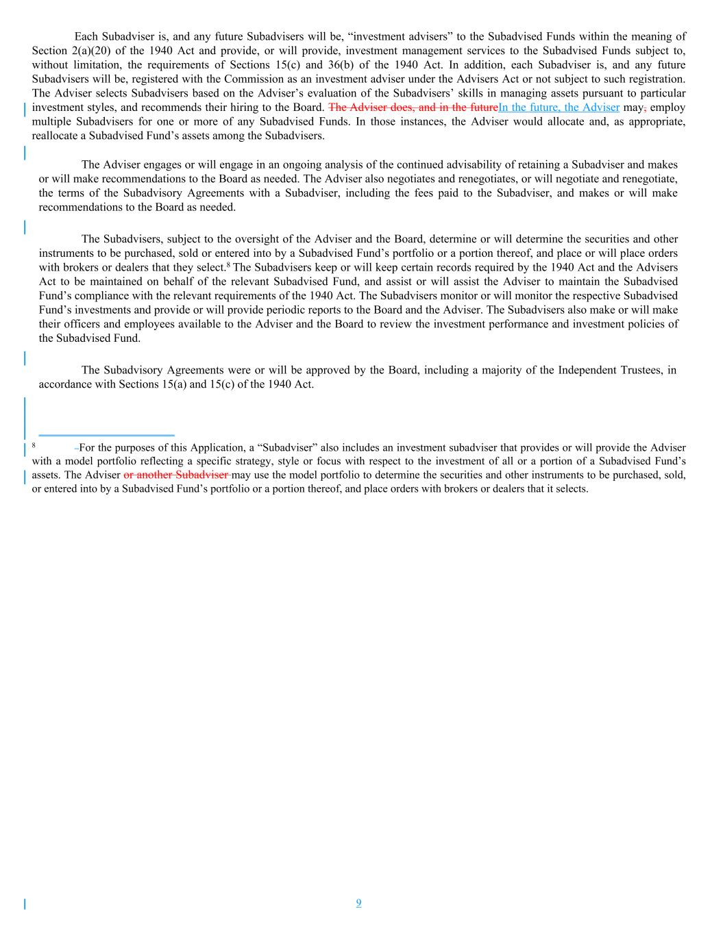 Each Subadviser is, and any future Subadvisers will be, “investment advisers” to the Subadvised Funds within the meaning of Section 2(a)(20) of the 1940 Act and provide, or will provide, investment management services to the Subadvised Funds subject to, without limitation, the requirements of Sections 15(c) and 36(b) of the 1940 Act. In addition, each Subadviser is, and any future Subadvisers will be, registered with the Commission as an investment adviser under the Advisers Act or not subject to such registration. The Adviser selects Subadvisers based on the Adviser’s evaluation of the Subadvisers’ skills in managing assets pursuant to particular investment styles, and recommends their hiring to the Board. The Adviser does, and in the futureIn the future, the Adviser may, employ multiple Subadvisers for one or more of any Subadvised Funds. In those instances, the Adviser would allocate and, as appropriate, reallocate a Subadvised Fund’s assets among the Subadvisers. The Adviser engages or will engage in an ongoing analysis of the continued advisability of retaining a Subadviser and makes or will make recommendations to the Board as needed. The Adviser also negotiates and renegotiates, or will negotiate and renegotiate, the terms of the Subadvisory Agreements with a Subadviser, including the fees paid to the Subadviser, and makes or will make recommendations to the Board as needed. The Subadvisers, subject to the oversight of the Adviser and the Board, determine or will determine the securities and other instruments to be purchased, sold or entered into by a Subadvised Fund’s portfolio or a portion thereof, and place or will place orders with brokers or dealers that they select.8 The Subadvisers keep or will keep certain records required by the 1940 Act and the Advisers Act to be maintained on behalf of the relevant Subadvised Fund, and assist or will assist the Adviser to maintain the Subadvised Fund’s compliance with the relevant requirements of the 1940 Act. The Subadvisers monitor or will monitor the respective Subadvised Fund’s investments and provide or will provide periodic reports to the Board and the Adviser. The Subadvisers also make or will make their officers and employees available to the Adviser and the Board to review the investment performance and investment policies of the Subadvised Fund. The Subadvisory Agreements were or will be approved by the Board, including a majority of the Independent Trustees, in accordance with Sections 15(a) and 15(c) of the 1940 Act. _______________________ 8 For the purposes of this Application, a “Subadviser” also includes an investment subadviser that provides or will provide the Adviser with a model portfolio reflecting a specific strategy, style or focus with respect to the investment of all or a portion of a Subadvised Fund’s assets. The Adviser or another Subadviser may use the model portfolio to determine the securities and other instruments to be purchased, sold, or entered into by a Subadvised Fund’s portfolio or a portion thereof, and place orders with brokers or dealers that it selects. 9