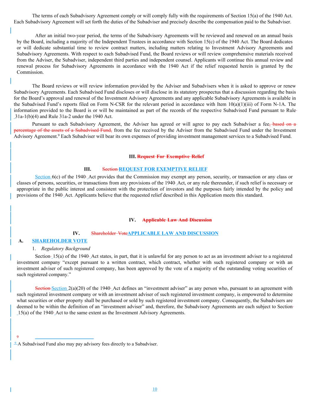 The terms of each Subadvisory Agreement comply or will comply fully with the requirements of Section 15(a) of the 1940 Act. Each Subadvisory Agreement will set forth the duties of the Subadviser and precisely describe the compensation paid to the Subadviser. After an initial two-year period, the terms of the Subadvisory Agreements will be reviewed and renewed on an annual basis by the Board, including a majority of the Independent Trustees in accordance with Section 15(c) of the 1940 Act. The Board dedicates or will dedicate substantial time to review contract matters, including matters relating to Investment Advisory Agreements and Subadvisory Agreements. With respect to each Subadvised Fund, the Board reviews or will review comprehensive materials received from the Adviser, the Subadviser, independent third parties and independent counsel. Applicants will continue this annual review and renewal process for Subadvisory Agreements in accordance with the 1940 Act if the relief requested herein is granted by the Commission. The Board reviews or will review information provided by the Adviser and Subadvisers when it is asked to approve or renew Subadvisory Agreements. Each Subadvised Fund discloses or will disclose in its statutory prospectus that a discussion regarding the basis for the Board’s approval and renewal of the Investment Advisory Agreements and any applicable Subadvisory Agreements is available in the Subadvised Fund’s reports filed on Form N-CSR for the relevant period in accordance with Item 10(a)(1)(iii) of Form N-1A. The information provided to the Board is or will be maintained as part of the records of the respective Subadvised Fund pursuant to Rule 31a-1(b)(4) and Rule 31a-2 under the 1940 Act. Pursuant to each Subadvisory Agreement, the Adviser has agreed or will agree to pay each Subadviser a fee, based on a percentage of the assets of a Subadvised Fund, from the fee received by the Adviser from the Subadvised Fund under the Investment Advisory Agreement.9 Each Subadviser will bear its own expenses of providing investment management services to a Subadvised Fund. III. Request For Exemptive Relief III. Section REQUEST FOR EXEMPTIVE RELIEF Section 6(c) of the 1940 Act provides that the Commission may exempt any person, security, or transaction or any class or classes of persons, securities, or transactions from any provisions of the 1940 Act, or any rule thereunder, if such relief is necessary or appropriate in the public interest and consistent with the protection of investors and the purposes fairly intended by the policy and provisions of the 1940 Act. Applicants believe that the requested relief described in this Application meets this standard. IV. Applicable Law And Discussion IV. Shareholder VoteAPPLICABLE LAW AND DISCUSSION A. SHAREHOLDER VOTE 1. Regulatory Background Section 15(a) of the 1940 Act states, in part, that it is unlawful for any person to act as an investment adviser to a registered investment company “except pursuant to a written contract, which contract, whether with such registered company or with an investment adviser of such registered company, has been approved by the vote of a majority of the outstanding voting securities of such registered company.” Section Section 2(a)(20) of the 1940 Act defines an “investment adviser” as any person who, pursuant to an agreement with such registered investment company or with an investment adviser of such registered investment company, is empowered to determine what securities or other property shall be purchased or sold by such registered investment company. Consequently, the Subadvisers are deemed to be within the definition of an “investment adviser” and, therefore, the Subadvisory Agreements are each subject to Section 15(a) of the 1940 Act to the same extent as the Investment Advisory Agreements. 9 _______________________ 9 A Subadvised Fund also may pay advisory fees directly to a Subadviser. 10