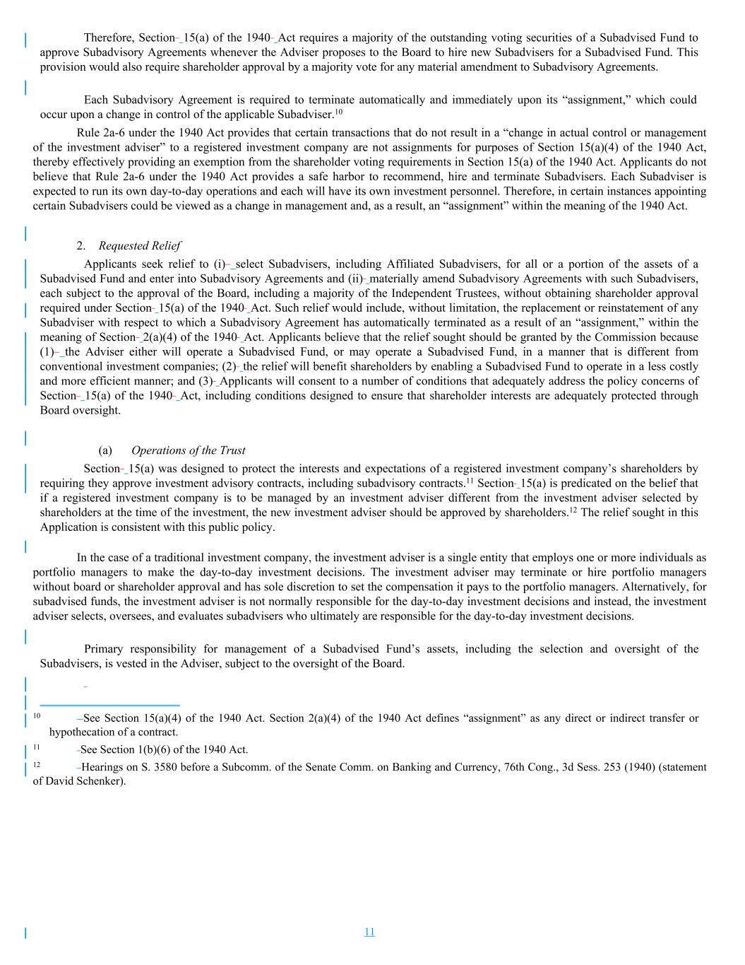 Therefore, Section 15(a) of the 1940 Act requires a majority of the outstanding voting securities of a Subadvised Fund to approve Subadvisory Agreements whenever the Adviser proposes to the Board to hire new Subadvisers for a Subadvised Fund. This provision would also require shareholder approval by a majority vote for any material amendment to Subadvisory Agreements. Each Subadvisory Agreement is required to terminate automatically and immediately upon its “assignment,” which could occur upon a change in control of the applicable Subadviser.10 Rule 2a-6 under the 1940 Act provides that certain transactions that do not result in a “change in actual control or management of the investment adviser” to a registered investment company are not assignments for purposes of Section 15(a)(4) of the 1940 Act, thereby effectively providing an exemption from the shareholder voting requirements in Section 15(a) of the 1940 Act. Applicants do not believe that Rule 2a-6 under the 1940 Act provides a safe harbor to recommend, hire and terminate Subadvisers. Each Subadviser is expected to run its own day-to-day operations and each will have its own investment personnel. Therefore, in certain instances appointing certain Subadvisers could be viewed as a change in management and, as a result, an “assignment” within the meaning of the 1940 Act. 2. Requested Relief Applicants seek relief to (i) select Subadvisers, including Affiliated Subadvisers, for all or a portion of the assets of a Subadvised Fund and enter into Subadvisory Agreements and (ii) materially amend Subadvisory Agreements with such Subadvisers, each subject to the approval of the Board, including a majority of the Independent Trustees, without obtaining shareholder approval required under Section 15(a) of the 1940 Act. Such relief would include, without limitation, the replacement or reinstatement of any Subadviser with respect to which a Subadvisory Agreement has automatically terminated as a result of an “assignment,” within the meaning of Section 2(a)(4) of the 1940 Act. Applicants believe that the relief sought should be granted by the Commission because (1) the Adviser either will operate a Subadvised Fund, or may operate a Subadvised Fund, in a manner that is different from conventional investment companies; (2) the relief will benefit shareholders by enabling a Subadvised Fund to operate in a less costly and more efficient manner; and (3) Applicants will consent to a number of conditions that adequately address the policy concerns of Section 15(a) of the 1940 Act, including conditions designed to ensure that shareholder interests are adequately protected through Board oversight. (a) Operations of the Trust Section 15(a) was designed to protect the interests and expectations of a registered investment company’s shareholders by requiring they approve investment advisory contracts, including subadvisory contracts.11 Section 15(a) is predicated on the belief that if a registered investment company is to be managed by an investment adviser different from the investment adviser selected by shareholders at the time of the investment, the new investment adviser should be approved by shareholders.12 The relief sought in this Application is consistent with this public policy. In the case of a traditional investment company, the investment adviser is a single entity that employs one or more individuals as portfolio managers to make the day-to-day investment decisions. The investment adviser may terminate or hire portfolio managers without board or shareholder approval and has sole discretion to set the compensation it pays to the portfolio managers. Alternatively, for subadvised funds, the investment adviser is not normally responsible for the day-to-day investment decisions and instead, the investment adviser selects, oversees, and evaluates subadvisers who ultimately are responsible for the day-to-day investment decisions. Primary responsibility for management of a Subadvised Fund’s assets, including the selection and oversight of the Subadvisers, is vested in the Adviser, subject to the oversight of the Board. _______________________ 10 See Section 15(a)(4) of the 1940 Act. Section 2(a)(4) of the 1940 Act defines “assignment” as any direct or indirect transfer or hypothecation of a contract. 11 See Section 1(b)(6) of the 1940 Act. 12 Hearings on S. 3580 before a Subcomm. of the Senate Comm. on Banking and Currency, 76th Cong., 3d Sess. 253 (1940) (statement of David Schenker). 11