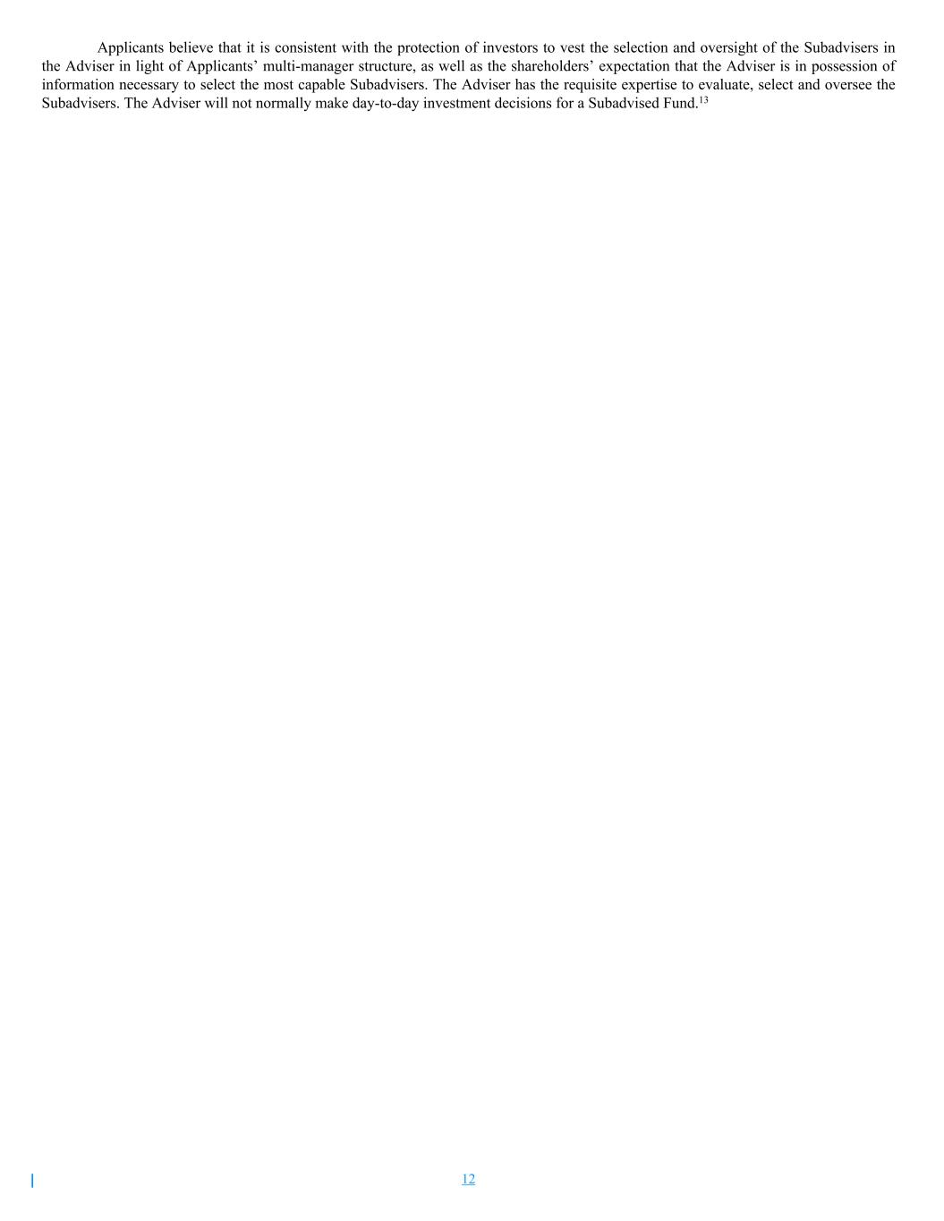 Applicants believe that it is consistent with the protection of investors to vest the selection and oversight of the Subadvisers in the Adviser in light of Applicants’ multi-manager structure, as well as the shareholders’ expectation that the Adviser is in possession of information necessary to select the most capable Subadvisers. The Adviser has the requisite expertise to evaluate, select and oversee the Subadvisers. The Adviser will not normally make day-to-day investment decisions for a Subadvised Fund.13 12