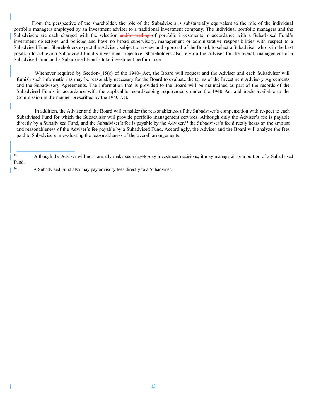 From the perspective of the shareholder, the role of the Subadvisers is substantially equivalent to the role of the individual portfolio managers employed by an investment adviser to a traditional investment company. The individual portfolio managers and the Subadvisers are each charged with the selection and/or trading of portfolio investments in accordance with a Subadvised Fund’s investment objectives and policies and have no broad supervisory, management or administrative responsibilities with respect to a Subadvised Fund. Shareholders expect the Adviser, subject to review and approval of the Board, to select a Subadviser who is in the best position to achieve a Subadvised Fund’s investment objective. Shareholders also rely on the Adviser for the overall management of a Subadvised Fund and a Subadvised Fund’s total investment performance. Whenever required by Section 15(c) of the 1940 Act, the Board will request and the Adviser and each Subadviser will furnish such information as may be reasonably necessary for the Board to evaluate the terms of the Investment Advisory Agreements and the Subadvisory Agreements. The information that is provided to the Board will be maintained as part of the records of the Subadvised Funds in accordance with the applicable recordkeeping requirements under the 1940 Act and made available to the Commission in the manner prescribed by the 1940 Act. In addition, the Adviser and the Board will consider the reasonableness of the Subadviser’s compensation with respect to each Subadvised Fund for which the Subadviser will provide portfolio management services. Although only the Adviser’s fee is payable directly by a Subadvised Fund, and the Subadviser’s fee is payable by the Adviser,14 the Subadviser’s fee directly bears on the amount and reasonableness of the Adviser’s fee payable by a Subadvised Fund. Accordingly, the Adviser and the Board will analyze the fees paid to Subadvisers in evaluating the reasonableness of the overall arrangements. _______________________ 13 Although the Adviser will not normally make such day-to-day investment decisions, it may manage all or a portion of a Subadvised Fund. 14 A Subadvised Fund also may pay advisory fees directly to a Subadviser. 13