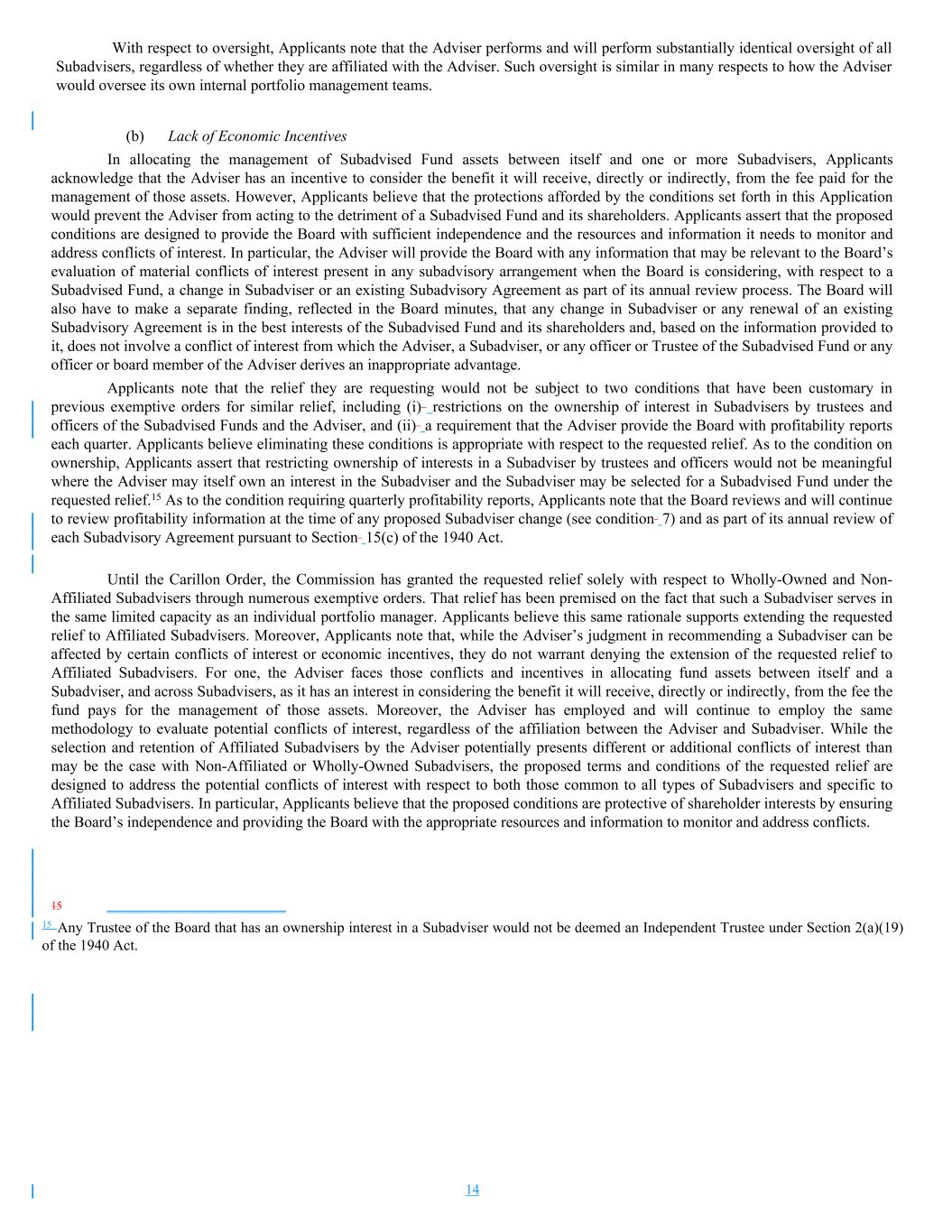 With respect to oversight, Applicants note that the Adviser performs and will perform substantially identical oversight of all Subadvisers, regardless of whether they are affiliated with the Adviser. Such oversight is similar in many respects to how the Adviser would oversee its own internal portfolio management teams. (b) Lack of Economic Incentives In allocating the management of Subadvised Fund assets between itself and one or more Subadvisers, Applicants acknowledge that the Adviser has an incentive to consider the benefit it will receive, directly or indirectly, from the fee paid for the management of those assets. However, Applicants believe that the protections afforded by the conditions set forth in this Application would prevent the Adviser from acting to the detriment of a Subadvised Fund and its shareholders. Applicants assert that the proposed conditions are designed to provide the Board with sufficient independence and the resources and information it needs to monitor and address conflicts of interest. In particular, the Adviser will provide the Board with any information that may be relevant to the Board’s evaluation of material conflicts of interest present in any subadvisory arrangement when the Board is considering, with respect to a Subadvised Fund, a change in Subadviser or an existing Subadvisory Agreement as part of its annual review process. The Board will also have to make a separate finding, reflected in the Board minutes, that any change in Subadviser or any renewal of an existing Subadvisory Agreement is in the best interests of the Subadvised Fund and its shareholders and, based on the information provided to it, does not involve a conflict of interest from which the Adviser, a Subadviser, or any officer or Trustee of the Subadvised Fund or any officer or board member of the Adviser derives an inappropriate advantage. Applicants note that the relief they are requesting would not be subject to two conditions that have been customary in previous exemptive orders for similar relief, including (i) restrictions on the ownership of interest in Subadvisers by trustees and officers of the Subadvised Funds and the Adviser, and (ii) a requirement that the Adviser provide the Board with profitability reports each quarter. Applicants believe eliminating these conditions is appropriate with respect to the requested relief. As to the condition on ownership, Applicants assert that restricting ownership of interests in a Subadviser by trustees and officers would not be meaningful where the Adviser may itself own an interest in the Subadviser and the Subadviser may be selected for a Subadvised Fund under the requested relief.15 As to the condition requiring quarterly profitability reports, Applicants note that the Board reviews and will continue to review profitability information at the time of any proposed Subadviser change (see condition 7) and as part of its annual review of each Subadvisory Agreement pursuant to Section 15(c) of the 1940 Act. Until the Carillon Order, the Commission has granted the requested relief solely with respect to Wholly-Owned and Non- Affiliated Subadvisers through numerous exemptive orders. That relief has been premised on the fact that such a Subadviser serves in the same limited capacity as an individual portfolio manager. Applicants believe this same rationale supports extending the requested relief to Affiliated Subadvisers. Moreover, Applicants note that, while the Adviser’s judgment in recommending a Subadviser can be affected by certain conflicts of interest or economic incentives, they do not warrant denying the extension of the requested relief to Affiliated Subadvisers. For one, the Adviser faces those conflicts and incentives in allocating fund assets between itself and a Subadviser, and across Subadvisers, as it has an interest in considering the benefit it will receive, directly or indirectly, from the fee the fund pays for the management of those assets. Moreover, the Adviser has employed and will continue to employ the same methodology to evaluate potential conflicts of interest, regardless of the affiliation between the Adviser and Subadviser. While the selection and retention of Affiliated Subadvisers by the Adviser potentially presents different or additional conflicts of interest than may be the case with Non-Affiliated or Wholly-Owned Subadvisers, the proposed terms and conditions of the requested relief are designed to address the potential conflicts of interest with respect to both those common to all types of Subadvisers and specific to Affiliated Subadvisers. In particular, Applicants believe that the proposed conditions are protective of shareholder interests by ensuring the Board’s independence and providing the Board with the appropriate resources and information to monitor and address conflicts. 15 _______________________ 15 Any Trustee of the Board that has an ownership interest in a Subadviser would not be deemed an Independent Trustee under Section 2(a)(19) of the 1940 Act. 14