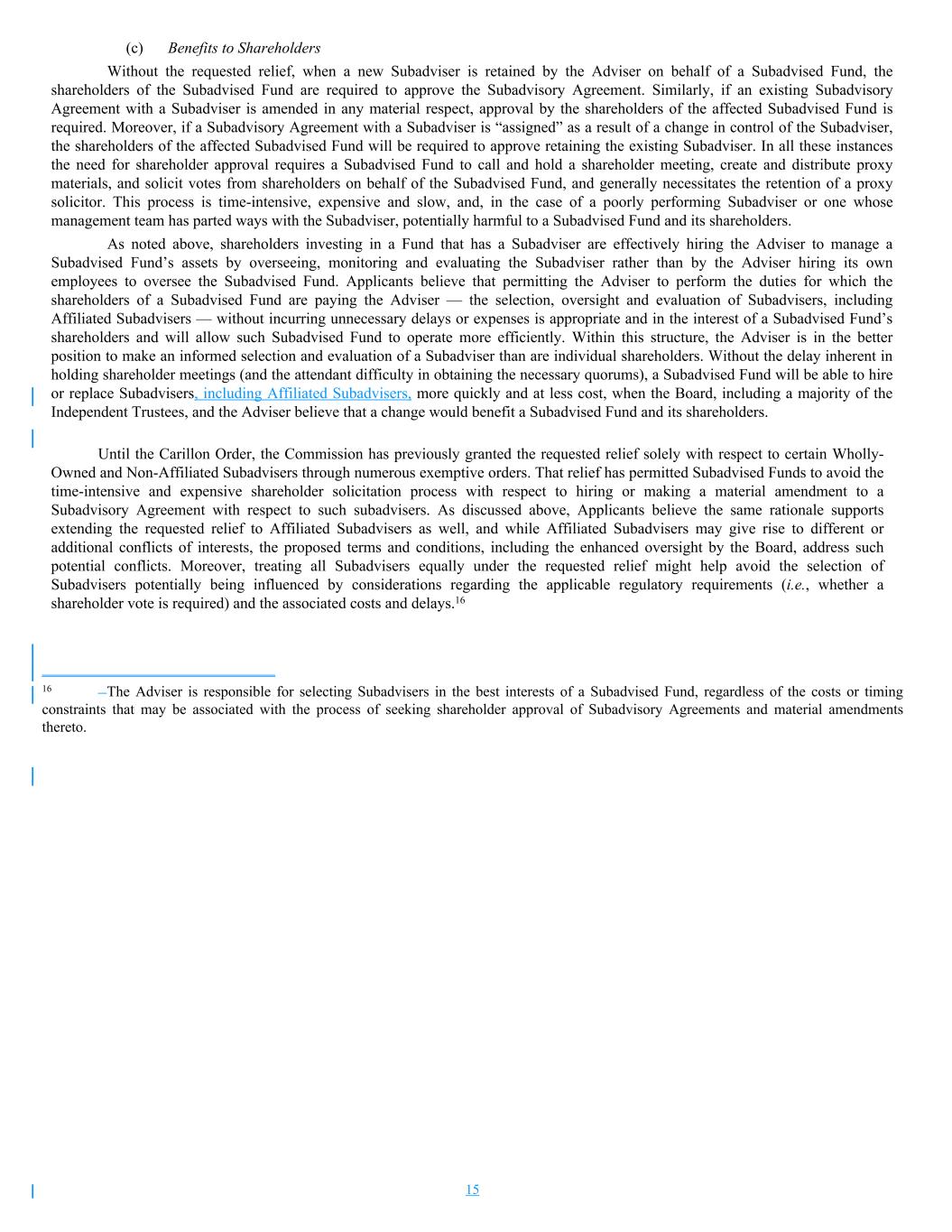 (c) Benefits to Shareholders Without the requested relief, when a new Subadviser is retained by the Adviser on behalf of a Subadvised Fund, the shareholders of the Subadvised Fund are required to approve the Subadvisory Agreement. Similarly, if an existing Subadvisory Agreement with a Subadviser is amended in any material respect, approval by the shareholders of the affected Subadvised Fund is required. Moreover, if a Subadvisory Agreement with a Subadviser is “assigned” as a result of a change in control of the Subadviser, the shareholders of the affected Subadvised Fund will be required to approve retaining the existing Subadviser. In all these instances the need for shareholder approval requires a Subadvised Fund to call and hold a shareholder meeting, create and distribute proxy materials, and solicit votes from shareholders on behalf of the Subadvised Fund, and generally necessitates the retention of a proxy solicitor. This process is time-intensive, expensive and slow, and, in the case of a poorly performing Subadviser or one whose management team has parted ways with the Subadviser, potentially harmful to a Subadvised Fund and its shareholders. As noted above, shareholders investing in a Fund that has a Subadviser are effectively hiring the Adviser to manage a Subadvised Fund’s assets by overseeing, monitoring and evaluating the Subadviser rather than by the Adviser hiring its own employees to oversee the Subadvised Fund. Applicants believe that permitting the Adviser to perform the duties for which the shareholders of a Subadvised Fund are paying the Adviser — the selection, oversight and evaluation of Subadvisers, including Affiliated Subadvisers — without incurring unnecessary delays or expenses is appropriate and in the interest of a Subadvised Fund’s shareholders and will allow such Subadvised Fund to operate more efficiently. Within this structure, the Adviser is in the better position to make an informed selection and evaluation of a Subadviser than are individual shareholders. Without the delay inherent in holding shareholder meetings (and the attendant difficulty in obtaining the necessary quorums), a Subadvised Fund will be able to hire or replace Subadvisers, including Affiliated Subadvisers, more quickly and at less cost, when the Board, including a majority of the Independent Trustees, and the Adviser believe that a change would benefit a Subadvised Fund and its shareholders. Until the Carillon Order, the Commission has previously granted the requested relief solely with respect to certain Wholly- Owned and Non-Affiliated Subadvisers through numerous exemptive orders. That relief has permitted Subadvised Funds to avoid the time-intensive and expensive shareholder solicitation process with respect to hiring or making a material amendment to a Subadvisory Agreement with respect to such subadvisers. As discussed above, Applicants believe the same rationale supports extending the requested relief to Affiliated Subadvisers as well, and while Affiliated Subadvisers may give rise to different or additional conflicts of interests, the proposed terms and conditions, including the enhanced oversight by the Board, address such potential conflicts. Moreover, treating all Subadvisers equally under the requested relief might help avoid the selection of Subadvisers potentially being influenced by considerations regarding the applicable regulatory requirements (i.e., whether a shareholder vote is required) and the associated costs and delays.16 ______________________________ 16 The Adviser is responsible for selecting Subadvisers in the best interests of a Subadvised Fund, regardless of the costs or timing constraints that may be associated with the process of seeking shareholder approval of Subadvisory Agreements and material amendments thereto. 15