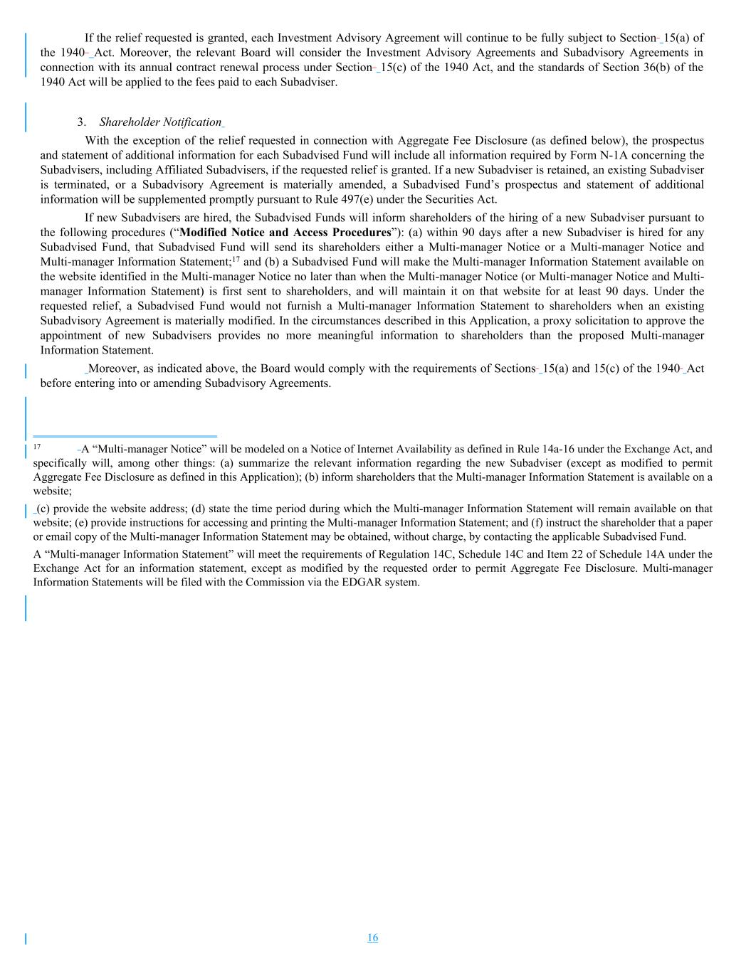 If the relief requested is granted, each Investment Advisory Agreement will continue to be fully subject to Section 15(a) of the 1940 Act. Moreover, the relevant Board will consider the Investment Advisory Agreements and Subadvisory Agreements in connection with its annual contract renewal process under Section 15(c) of the 1940 Act, and the standards of Section 36(b) of the 1940 Act will be applied to the fees paid to each Subadviser. 3. Shareholder Notification With the exception of the relief requested in connection with Aggregate Fee Disclosure (as defined below), the prospectus and statement of additional information for each Subadvised Fund will include all information required by Form N-1A concerning the Subadvisers, including Affiliated Subadvisers, if the requested relief is granted. If a new Subadviser is retained, an existing Subadviser is terminated, or a Subadvisory Agreement is materially amended, a Subadvised Fund’s prospectus and statement of additional information will be supplemented promptly pursuant to Rule 497(e) under the Securities Act. If new Subadvisers are hired, the Subadvised Funds will inform shareholders of the hiring of a new Subadviser pursuant to the following procedures (“Modified Notice and Access Procedures”): (a) within 90 days after a new Subadviser is hired for any Subadvised Fund, that Subadvised Fund will send its shareholders either a Multi-manager Notice or a Multi-manager Notice and Multi-manager Information Statement;17 and (b) a Subadvised Fund will make the Multi-manager Information Statement available on the website identified in the Multi-manager Notice no later than when the Multi-manager Notice (or Multi-manager Notice and Multi- manager Information Statement) is first sent to shareholders, and will maintain it on that website for at least 90 days. Under the requested relief, a Subadvised Fund would not furnish a Multi-manager Information Statement to shareholders when an existing Subadvisory Agreement is materially modified. In the circumstances described in this Application, a proxy solicitation to approve the appointment of new Subadvisers provides no more meaningful information to shareholders than the proposed Multi-manager Information Statement. Moreover, as indicated above, the Board would comply with the requirements of Sections 15(a) and 15(c) of the 1940 Act before entering into or amending Subadvisory Agreements. ______________________________ 17 A “Multi-manager Notice” will be modeled on a Notice of Internet Availability as defined in Rule 14a-16 under the Exchange Act, and specifically will, among other things: (a) summarize the relevant information regarding the new Subadviser (except as modified to permit Aggregate Fee Disclosure as defined in this Application); (b) inform shareholders that the Multi-manager Information Statement is available on a website; (c) provide the website address; (d) state the time period during which the Multi-manager Information Statement will remain available on that website; (e) provide instructions for accessing and printing the Multi-manager Information Statement; and (f) instruct the shareholder that a paper or email copy of the Multi-manager Information Statement may be obtained, without charge, by contacting the applicable Subadvised Fund. A “Multi-manager Information Statement” will meet the requirements of Regulation 14C, Schedule 14C and Item 22 of Schedule 14A under the Exchange Act for an information statement, except as modified by the requested order to permit Aggregate Fee Disclosure. Multi-manager Information Statements will be filed with the Commission via the EDGAR system. 16
