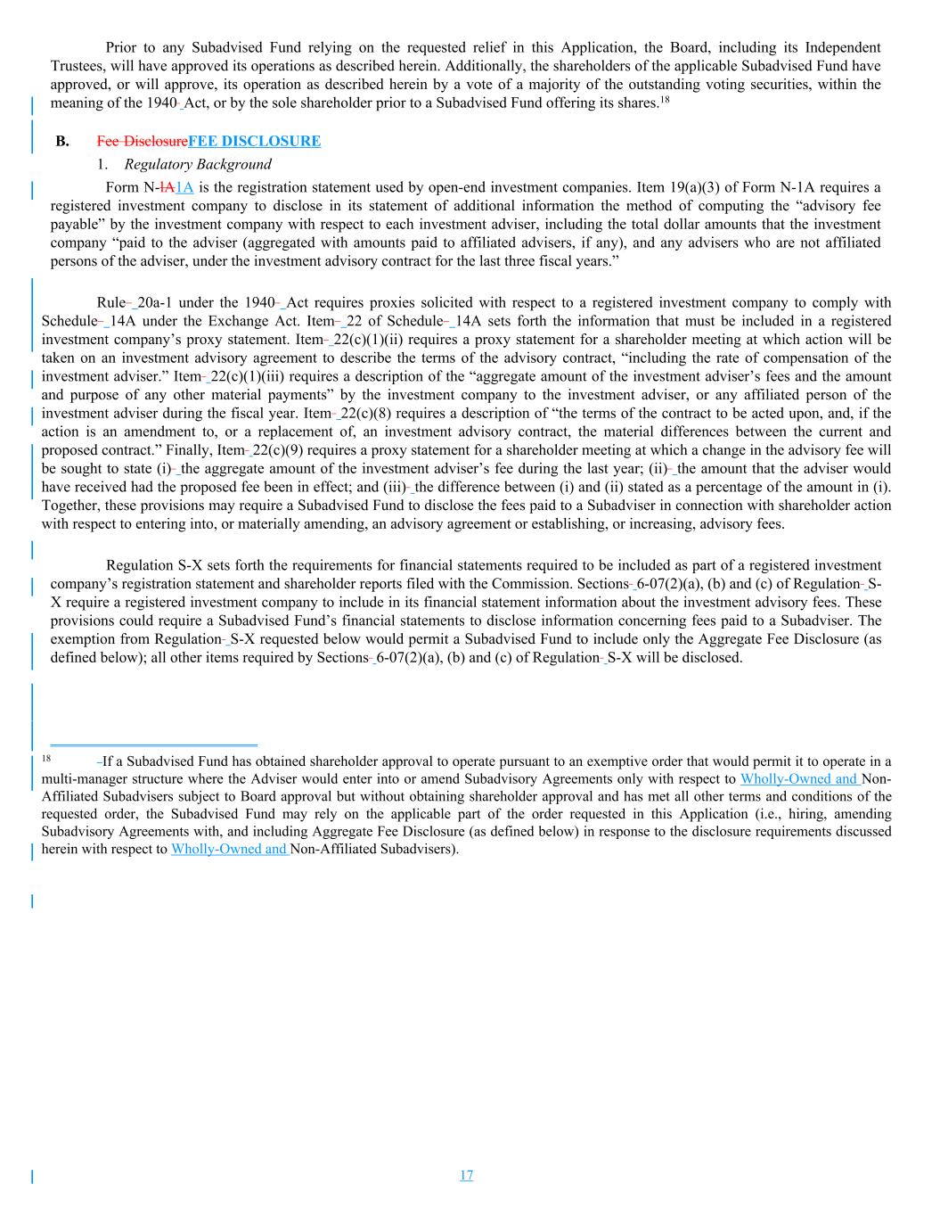 Prior to any Subadvised Fund relying on the requested relief in this Application, the Board, including its Independent Trustees, will have approved its operations as described herein. Additionally, the shareholders of the applicable Subadvised Fund have approved, or will approve, its operation as described herein by a vote of a majority of the outstanding voting securities, within the meaning of the 1940 Act, or by the sole shareholder prior to a Subadvised Fund offering its shares.18 B. Fee DisclosureFEE DISCLOSURE 1. Regulatory Background Form N-lA1A is the registration statement used by open-end investment companies. Item 19(a)(3) of Form N-1A requires a registered investment company to disclose in its statement of additional information the method of computing the “advisory fee payable” by the investment company with respect to each investment adviser, including the total dollar amounts that the investment company “paid to the adviser (aggregated with amounts paid to affiliated advisers, if any), and any advisers who are not affiliated persons of the adviser, under the investment advisory contract for the last three fiscal years.” Rule 20a-1 under the 1940 Act requires proxies solicited with respect to a registered investment company to comply with Schedule 14A under the Exchange Act. Item 22 of Schedule 14A sets forth the information that must be included in a registered investment company’s proxy statement. Item 22(c)(1)(ii) requires a proxy statement for a shareholder meeting at which action will be taken on an investment advisory agreement to describe the terms of the advisory contract, “including the rate of compensation of the investment adviser.” Item 22(c)(1)(iii) requires a description of the “aggregate amount of the investment adviser’s fees and the amount and purpose of any other material payments” by the investment company to the investment adviser, or any affiliated person of the investment adviser during the fiscal year. Item 22(c)(8) requires a description of “the terms of the contract to be acted upon, and, if the action is an amendment to, or a replacement of, an investment advisory contract, the material differences between the current and proposed contract.” Finally, Item 22(c)(9) requires a proxy statement for a shareholder meeting at which a change in the advisory fee will be sought to state (i) the aggregate amount of the investment adviser’s fee during the last year; (ii) the amount that the adviser would have received had the proposed fee been in effect; and (iii) the difference between (i) and (ii) stated as a percentage of the amount in (i). Together, these provisions may require a Subadvised Fund to disclose the fees paid to a Subadviser in connection with shareholder action with respect to entering into, or materially amending, an advisory agreement or establishing, or increasing, advisory fees. Regulation S-X sets forth the requirements for financial statements required to be included as part of a registered investment company’s registration statement and shareholder reports filed with the Commission. Sections 6-07(2)(a), (b) and (c) of Regulation S- X require a registered investment company to include in its financial statement information about the investment advisory fees. These provisions could require a Subadvised Fund’s financial statements to disclose information concerning fees paid to a Subadviser. The exemption from Regulation S-X requested below would permit a Subadvised Fund to include only the Aggregate Fee Disclosure (as defined below); all other items required by Sections 6-07(2)(a), (b) and (c) of Regulation S-X will be disclosed. ___________________________ 18 If a Subadvised Fund has obtained shareholder approval to operate pursuant to an exemptive order that would permit it to operate in a multi-manager structure where the Adviser would enter into or amend Subadvisory Agreements only with respect to Wholly-Owned and Non- Affiliated Subadvisers subject to Board approval but without obtaining shareholder approval and has met all other terms and conditions of the requested order, the Subadvised Fund may rely on the applicable part of the order requested in this Application (i.e., hiring, amending Subadvisory Agreements with, and including Aggregate Fee Disclosure (as defined below) in response to the disclosure requirements discussed herein with respect to Wholly-Owned and Non-Affiliated Subadvisers). 17