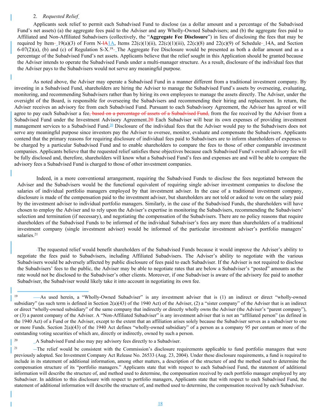 2. Requested Relief Applicants seek relief to permit each Subadvised Fund to disclose (as a dollar amount and a percentage of the Subadvised Fund’s net assets) (a) the aggregate fees paid to the Adviser and any Wholly-Owned Subadvisers; and (b) the aggregate fees paid to Affiliated and Non-Affiliated Subadvisers (collectively, the “Aggregate Fee Disclosure”) in lieu of disclosing the fees that may be required by Item 19(a)(3) of Form N-lA1A, Items 22(c)(1)(ii), 22(c)(1)(iii), 22(c)(8) and 22(c)(9) of Schedule 14A, and Section 6-07(2)(a), (b) and (c) of Regulation S-X.19 The Aggregate Fee Disclosure would be presented as both a dollar amount and as a percentage of the Subadvised Fund’s net assets. Applicants believe that the relief sought in this Application should be granted because the Adviser intends to operate the Subadvised Funds under a multi-manager structure. As a result, disclosure of the individual fees that the Adviser pays to the Subadvisers would not serve any meaningful purpose. As noted above, the Adviser may operate a Subadvised Fund in a manner different from a traditional investment company. By investing in a Subadvised Fund, shareholders are hiring the Adviser to manage the Subadvised Fund’s assets by overseeing, evaluating, monitoring, and recommending Subadvisers rather than by hiring its own employees to manage the assets directly. The Adviser, under the oversight of the Board, is responsible for overseeing the Subadvisers and recommending their hiring and replacement. In return, the Adviser receives an advisory fee from each Subadvised Fund. Pursuant to each Subadvisory Agreement, the Adviser has agreed or will agree to pay each Subadviser a fee, based on a percentage of assets of a Subadvised Fund, from the fee received by the Adviser from a Subadvised Fund under the Investment Advisory Agreement.20 Each Subadviser will bear its own expenses of providing investment management services to a Subadvised Fund.20 Disclosure of the individual fees that the Adviser would pay to the Subadvisers does not serve any meaningful purpose since investors pay the Adviser to oversee, monitor, evaluate and compensate the Subadvisers. Applicants contend that the primary reasons for requiring disclosure of individual fees paid to Subadvisers are to inform shareholders of expenses to be charged by a particular Subadvised Fund and to enable shareholders to compare the fees to those of other comparable investment companies. Applicants believe that the requested relief satisfies these objectives because each Subadvised Fund’s overall advisory fee will be fully disclosed and, therefore, shareholders will know what a Subadvised Fund’s fees and expenses are and will be able to compare the advisory fees a Subadvised Fund is charged to those of other investment companies. Indeed, in a more conventional arrangement, requiring the Subadvised Funds to disclose the fees negotiated between the Adviser and the Subadvisers would be the functional equivalent of requiring single adviser investment companies to disclose the salaries of individual portfolio managers employed by that investment adviser. In the case of a traditional investment company, disclosure is made of the compensation paid to the investment adviser, but shareholders are not told or asked to vote on the salary paid by the investment adviser to individual portfolio managers. Similarly, in the case of the Subadvised Funds, the shareholders will have chosen to employ the Adviser and to rely upon the Adviser’s expertise in monitoring the Subadvisers, recommending the Subadvisers’ selection and termination (if necessary), and negotiating the compensation of the Subadvisers. There are no policy reasons that require shareholders of the Subadvised Funds to be informed of the individual Subadviser’s fees any more than shareholders of a traditional investment company (single investment adviser) would be informed of the particular investment adviser’s portfolio managers’ salaries.21 The requested relief would benefit shareholders of the Subadvised Funds because it would improve the Adviser’s ability to negotiate the fees paid to Subadvisers, including Affiliated Subadvisers. The Adviser’s ability to negotiate with the various Subadvisers would be adversely affected by public disclosure of fees paid to each Subadviser. If the Adviser is not required to disclose the Subadvisers’ fees to the public, the Adviser may be able to negotiate rates that are below a Subadviser’s “posted” amounts as the rate would not be disclosed to the Subadviser’s other clients. Moreover, if one Subadviser is aware of the advisory fee paid to another Subadviser, the Subadviser would likely take it into account in negotiating its own fee. ___________________________ 19 As used herein, a “Wholly-Owned Subadviser” is any investment adviser that is (1) an indirect or direct “wholly-owned subsidiary” (as such term is defined in Section 2(a)(43) of the 1940 Act) of the Adviser, (2) a “sister company” of the Adviser that is an indirect or direct “wholly-owned subsidiary” of the same company that indirectly or directly wholly owns the Adviser (the Adviser’s “parent company”), or (3) a parent company of the Adviser. A “Non-Affiliated Subadviser” is any investment adviser that is not an “affiliated person” (as defined in the 1940 Act) of a Fund or the Adviser, except to the extent that an affiliation arises solely because the Subadviser serves as a subadviser to one or more Funds. Section 2(a)(43) of the 1940 Act defines “wholly-owned subsidiary” of a person as a company 95 per centum or more of the outstanding voting securities of which are, directly or indirectly, owned by such a person. 20 A Subadvised Fund also may pay advisory fees directly to a Subadviser. 21 The relief would be consistent with the Commission’s disclosure requirements applicable to fund portfolio managers that were previously adopted. 