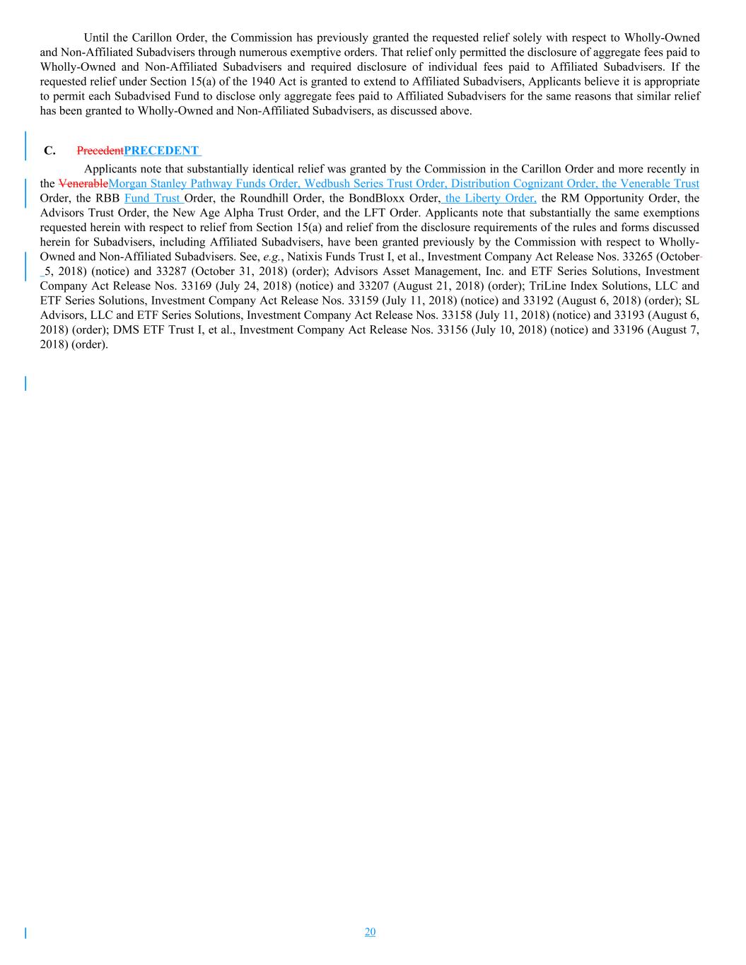Until the Carillon Order, the Commission has previously granted the requested relief solely with respect to Wholly-Owned and Non-Affiliated Subadvisers through numerous exemptive orders. That relief only permitted the disclosure of aggregate fees paid to Wholly-Owned and Non-Affiliated Subadvisers and required disclosure of individual fees paid to Affiliated Subadvisers. If the requested relief under Section 15(a) of the 1940 Act is granted to extend to Affiliated Subadvisers, Applicants believe it is appropriate to permit each Subadvised Fund to disclose only aggregate fees paid to Affiliated Subadvisers for the same reasons that similar relief has been granted to Wholly-Owned and Non-Affiliated Subadvisers, as discussed above. C. PrecedentPRECEDENT Applicants note that substantially identical relief was granted by the Commission in the Carillon Order and more recently in the VenerableMorgan Stanley Pathway Funds Order, Wedbush Series Trust Order, Distribution Cognizant Order, the Venerable Trust Order, the RBB Fund Trust Order, the Roundhill Order, the BondBloxx Order, the Liberty Order, the RM Opportunity Order, the Advisors Trust Order, the New Age Alpha Trust Order, and the LFT Order. Applicants note that substantially the same exemptions requested herein with respect to relief from Section 15(a) and relief from the disclosure requirements of the rules and forms discussed herein for Subadvisers, including Affiliated Subadvisers, have been granted previously by the Commission with respect to Wholly- Owned and Non-Affiliated Subadvisers. See, e.g., Natixis Funds Trust I, et al., Investment Company Act Release Nos. 33265 (October 5, 2018) (notice) and 33287 (October 31, 2018) (order); Advisors Asset Management, Inc. and ETF Series Solutions, Investment Company Act Release Nos. 33169 (July 24, 2018) (notice) and 33207 (August 21, 2018) (order); TriLine Index Solutions, LLC and ETF Series Solutions, Investment Company Act Release Nos. 33159 (July 11, 2018) (notice) and 33192 (August 6, 2018) (order); SL Advisors, LLC and ETF Series Solutions, Investment Company Act Release Nos. 33158 (July 11, 2018) (notice) and 33193 (August 6, 2018) (order); DMS ETF Trust I, et al., Investment Company Act Release Nos. 33156 (July 10, 2018) (notice) and 33196 (August 7, 2018) (order). 20