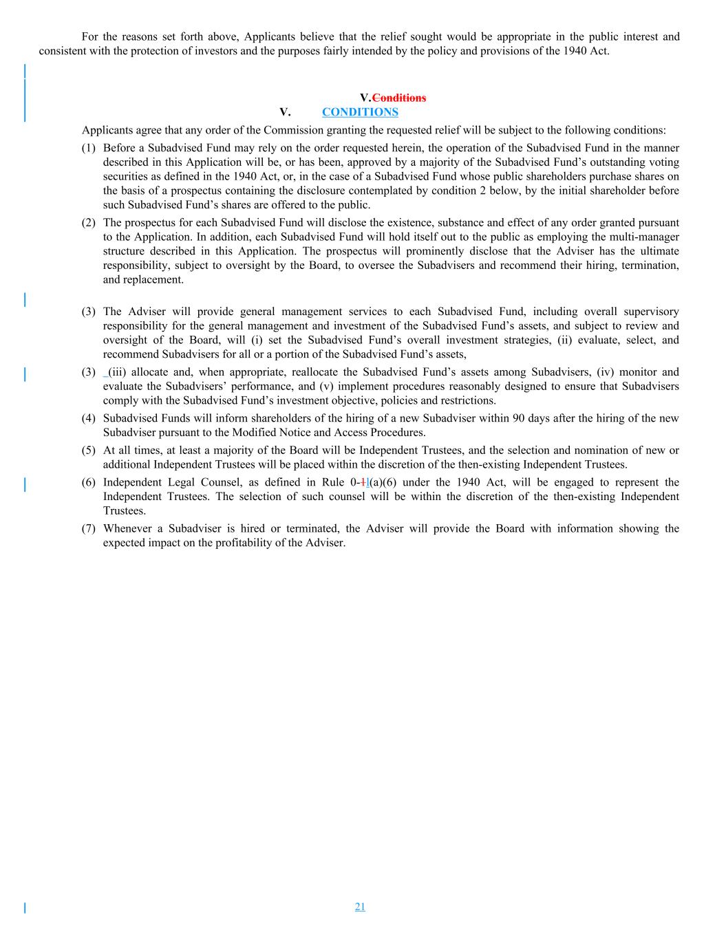 For the reasons set forth above, Applicants believe that the relief sought would be appropriate in the public interest and consistent with the protection of investors and the purposes fairly intended by the policy and provisions of the 1940 Act. V.Conditions V. CONDITIONS Applicants agree that any order of the Commission granting the requested relief will be subject to the following conditions: (1) Before a Subadvised Fund may rely on the order requested herein, the operation of the Subadvised Fund in the manner described in this Application will be, or has been, approved by a majority of the Subadvised Fund’s outstanding voting securities as defined in the 1940 Act, or, in the case of a Subadvised Fund whose public shareholders purchase shares on the basis of a prospectus containing the disclosure contemplated by condition 2 below, by the initial shareholder before such Subadvised Fund’s shares are offered to the public. (2) The prospectus for each Subadvised Fund will disclose the existence, substance and effect of any order granted pursuant to the Application. In addition, each Subadvised Fund will hold itself out to the public as employing the multi-manager structure described in this Application. The prospectus will prominently disclose that the Adviser has the ultimate responsibility, subject to oversight by the Board, to oversee the Subadvisers and recommend their hiring, termination, and replacement. (3) The Adviser will provide general management services to each Subadvised Fund, including overall supervisory responsibility for the general management and investment of the Subadvised Fund’s assets, and subject to review and oversight of the Board, will (i) set the Subadvised Fund’s overall investment strategies, (ii) evaluate, select, and recommend Subadvisers for all or a portion of the Subadvised Fund’s assets, (3) (iii) allocate and, when appropriate, reallocate the Subadvised Fund’s assets among Subadvisers, (iv) monitor and evaluate the Subadvisers’ performance, and (v) implement procedures reasonably designed to ensure that Subadvisers comply with the Subadvised Fund’s investment objective, policies and restrictions. (4) Subadvised Funds will inform shareholders of the hiring of a new Subadviser within 90 days after the hiring of the new Subadviser pursuant to the Modified Notice and Access Procedures. (5) At all times, at least a majority of the Board will be Independent Trustees, and the selection and nomination of new or additional Independent Trustees will be placed within the discretion of the then-existing Independent Trustees. (6) Independent Legal Counsel, as defined in Rule 0-1l(a)(6) under the 1940 Act, will be engaged to represent the Independent Trustees. The selection of such counsel will be within the discretion of the then-existing Independent Trustees. (7) Whenever a Subadviser is hired or terminated, the Adviser will provide the Board with information showing the expected impact on the profitability of the Adviser. 21