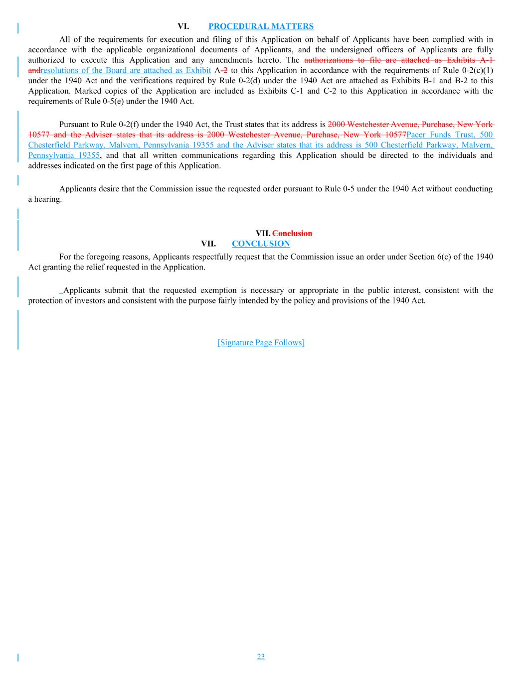 VI. PROCEDURAL MATTERS All of the requirements for execution and filing of this Application on behalf of Applicants have been complied with in accordance with the applicable organizational documents of Applicants, and the undersigned officers of Applicants are fully authorized to execute this Application and any amendments hereto. The authorizations to file are attached as Exhibits A-1 andresolutions of the Board are attached as Exhibit A-2 to this Application in accordance with the requirements of Rule 0-2(c)(1) under the 1940 Act and the verifications required by Rule 0-2(d) under the 1940 Act are attached as Exhibits B-1 and B-2 to this Application. Marked copies of the Application are included as Exhibits C-1 and C-2 to this Application in accordance with the requirements of Rule 0-5(e) under the 1940 Act. Pursuant to Rule 0-2(f) under the 1940 Act, the Trust states that its address is 2000 Westchester Avenue, Purchase, New York 10577 and the Adviser states that its address is 2000 Westchester Avenue, Purchase, New York 10577Pacer Funds Trust, 500 Chesterfield Parkway, Malvern, Pennsylvania 19355 and the Adviser states that its address is 500 Chesterfield Parkway, Malvern, Pennsylvania 19355, and that all written communications regarding this Application should be directed to the individuals and addresses indicated on the first page of this Application. Applicants desire that the Commission issue the requested order pursuant to Rule 0-5 under the 1940 Act without conducting a hearing. VII. Conclusion VII. CONCLUSION For the foregoing reasons, Applicants respectfully request that the Commission issue an order under Section 6(c) of the 1940 Act granting the relief requested in the Application. Applicants submit that the requested exemption is necessary or appropriate in the public interest, consistent with the protection of investors and consistent with the purpose fairly intended by the policy and provisions of the 1940 Act. [Signature Page Follows] 23