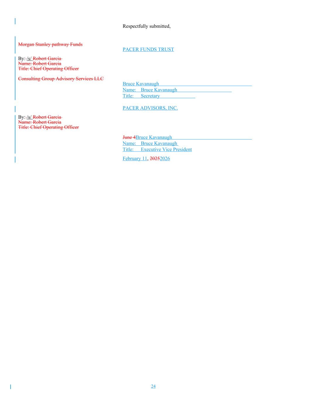 Respectfully submitted, Morgan Stanley pathway Funds PACER FUNDS TRUST By: /s/ Robert Garcia Name: Robert Garcia Title: Chief Operating Officer Consulting Group Advisory Services LLC Bruce Kavanaugh Name: Bruce Kavanaugh Title: Secretary PACER ADVISORS, INC. By: /s/ Robert Garcia Name: Robert Garcia Title: Chief Operating Officer June 4Bruce Kavanaugh Name: Bruce Kavanaugh Title: Executive Vice President February 11, 20252026 24