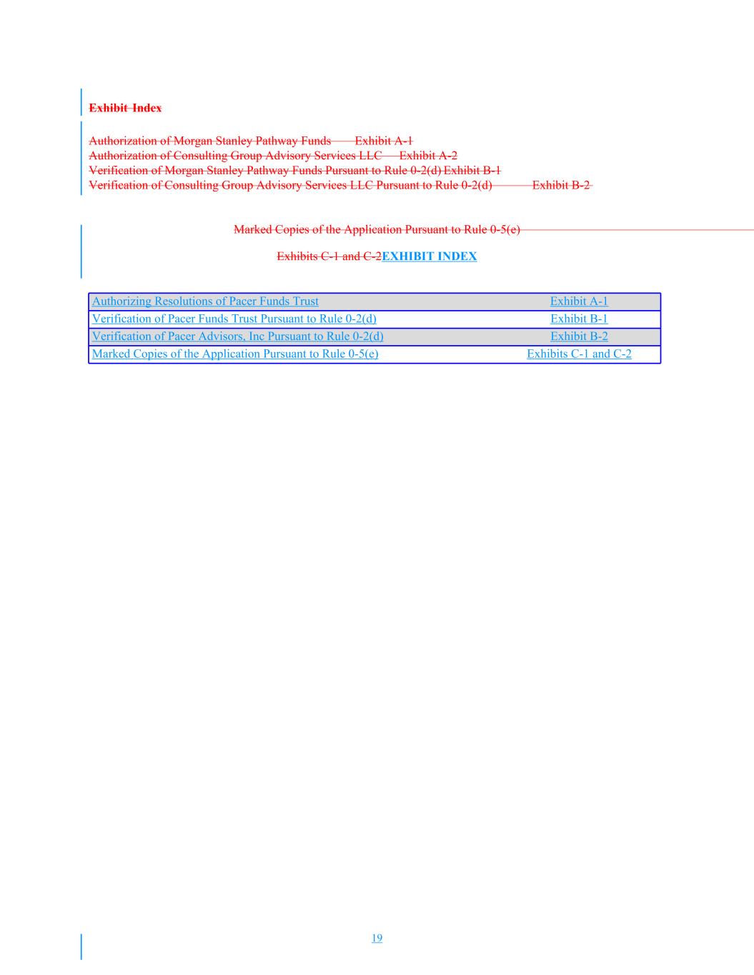 Exhibit Index Authorization of Morgan Stanley Pathway Funds Exhibit A-1 Authorization of Consulting Group Advisory Services LLC Exhibit A-2 Verification of Morgan Stanley Pathway Funds Pursuant to Rule 0-2(d) Exhibit B-1 Verification of Consulting Group Advisory Services LLC Pursuant to Rule 0-2(d) Exhibit B-2 Marked Copies of the Application Pursuant to Rule 0-5(e) Exhibits C-1 and C-2EXHIBIT INDEX Authorizing Resolutions of Pacer Funds Trust Exhibit A-1 Verification of Pacer Funds Trust Pursuant to Rule 0-2(d) Exhibit B-1 Verification of Pacer Advisors, Inc Pursuant to Rule 0-2(d) Exhibit B-2 Marked Copies of the Application Pursuant to Rule 0-5(e) Exhibits C-1 and C-2 19