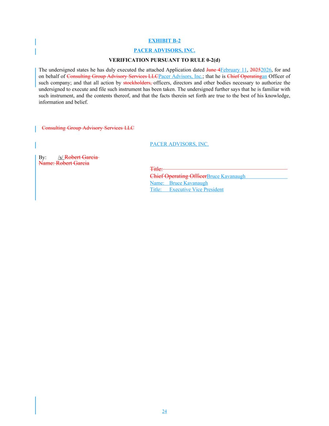 EXHIBIT B-2 PACER ADVISORS, INC. VERIFICATION PURSUANT TO RULE 0-2(d) The undersigned states he has duly executed the attached Application dated June 4February 11, 20252026, for and on behalf of Consulting Group Advisory Services LLCPacer Advisors, Inc.; that he is Chief Operatingan Officer of such company; and that all action by stockholders, officers, directors and other bodies necessary to authorize the undersigned to execute and file such instrument has been taken. The undersigned further says that he is familiar with such instrument, and the contents thereof, and that the facts therein set forth are true to the best of his knowledge, information and belief. Consulting Group Advisory Services LLC PACER ADVISORS, INC. By: /s/ Robert Garcia Name: Robert Garcia Title: Chief Operating OfficerBruce Kavanaugh Name: Bruce Kavanaugh Title: Executive Vice President 24