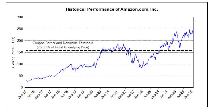 The following graph sets forth the historical performance of the Underlying from January 4, 2016 through February 6, 2026, based on the daily Closing Prices of the Underlying. The Closing Price of the Underlying on February 6, 2026 was $210.32. The dotted line represents the Coupon Barrier and the Downside Threshold of $157.74, which is equal to 75.00% of the Initial Underlying Price.
