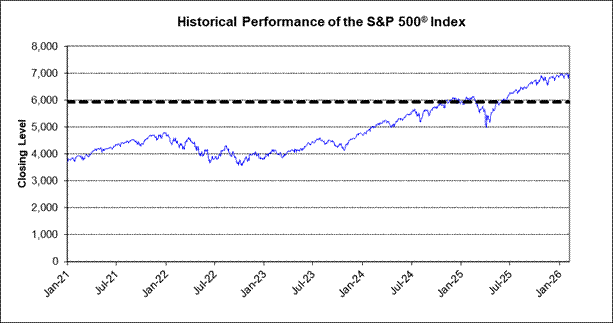 The following graph sets forth the historical performance of the underlier based on the daily closing levels from January 4, 2021 through February 9, 2026. The closing level of the underlier on February 9, 2026 was 6,964.82. The dotted line indicates a hypothetical buffer level of 85.00% of the closing level of the underlier on February 9, 2026. The actual buffer level will be equal to 85.00% of the initial underlier level.