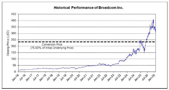 The graph below illustrates the historical performance of the AVGO Underlying from January 4, 2016 through February 5, 2026. The Closing Price of the AVGO Underlying on February 5, 2026 was $310.51. The dotted line represents the Conversion Price of $232.88, which is equal to 75.00% of the Initial Underlying Price of the AVGO Underlying.