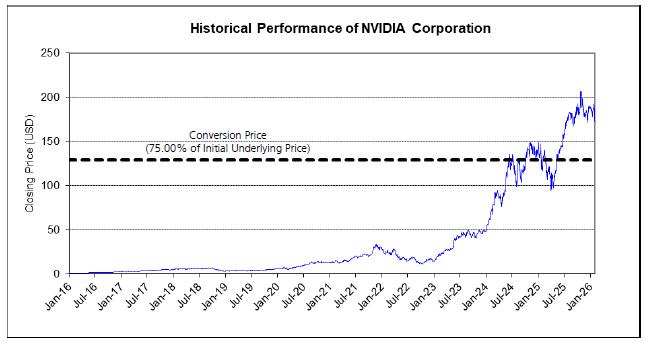 The graph below illustrates the historical performance of the NVDA Underlying from January 4, 2016 through February 5, 2026. The Closing Price of the NVDA Underlying on February 5, 2026 was $171.88. The dotted line represents the Conversion Price of $128.91, which is equal to 75.00% of the Initial Underlying Price of the NVDA Underlying.