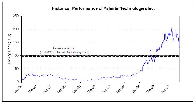 The graph below illustrates the historical performance of the PLTR Underlying from September 30, 2020 through February 5, 2026. The Closing Price of the PLTR Underlying on February 5, 2026 was $130.01. The PLTR Underlying began trading on the New York Stock Exchange on September 30, 2020 (but currently trades on The Nasdaq Stock Market) and therefore has limited performance history. The dotted line represents the Conversion Price of $97.51, which is equal to 75.00% of the Initial Underlying Price of the PLTR Underlying.