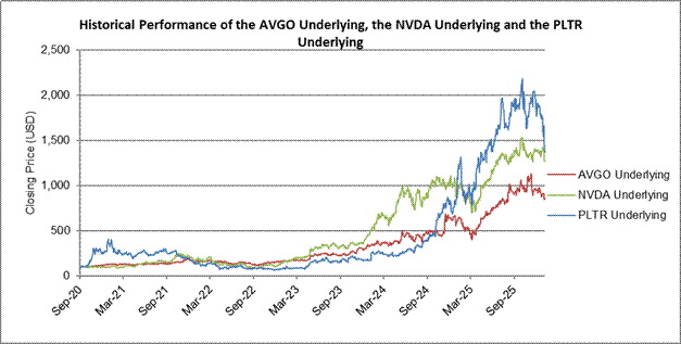 The following graph sets forth the historical performances of the AVGO Underlying, the NVDA Underlying and the PLTR Underlying from September 30, 2020 through February 5, 2026, based on the daily Closing Prices of the Underlyings. For comparison purposes, each Underlying has been normalized to have a Closing Price of $100.00 on September 30, 2020 by dividing the Closing Price of that Underlying on each day by the Closing Price of that Underlying on September 30, 2020 and multiplying by $100.00.