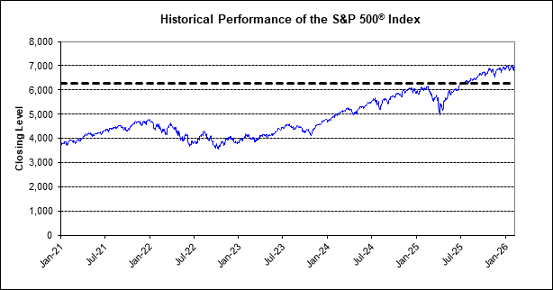 The following graph sets forth the historical performance of the underlier based on the daily closing levels from January 4, 2021 through February 9, 2026. The closing level of the underlier on February 9, 2026 was 6,964.82. The dotted line indicates a hypothetical buffer level of 90.00% of the closing level of the underlier on February 9, 2026. The actual buffer level will be equal to 90.00% of the initial underlier level.