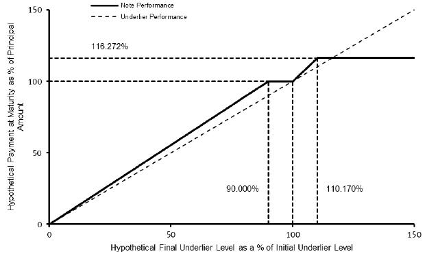 The following chart also shows a graphical illustration of the hypothetical cash settlement amounts (expressed as a percentage of the face amount of your notes) that we would pay on your notes on the stated maturity date, if the final underlier level (expressed as a percentage of the initial underlier level) were any of the hypothetical levels shown on the horizontal axis. The chart shows that any hypothetical final underlier level (expressed as a percentage of the initial underlier level) of less than 90.000% (the section left of the 90.000% marker on the horizontal axis) would result in a hypothetical cash settlement amount of less than 100.000% of the face amount of your notes (the section below the 100.000% marker on the vertical axis) and, accordingly, in a loss of principal to the holder of the notes. The chart also shows that any hypothetical final underlier level (expressed as a percentage of the initial underlier level) of greater than 110.170% (the section right of the 110.170% marker on the horizontal axis) would result in a capped return on your investment.