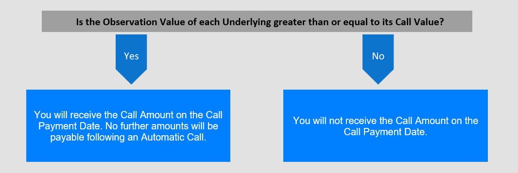 All (but not less than all) of the Notes will be automatically called at an amount equal to the Call Amount if the Observation Value of each Underlying is greater than or equal to its Call Value on the Call Observation Date. If the Notes are automatically called, the Call Amount will be paid on the Call Payment Date. No further amounts will be payable following an Automatic Call. |