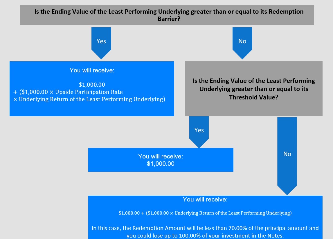 •However, assuming the Notes are not called prior to maturity, if either Underlying declines by more than 30% from its Starting Value, at maturity your investment will be subject to 1:1 downside exposure to decreases in the value of the Least Performing Underlying, with up to 100% of the principal at risk. Otherwise, if the Notes are not called prior to maturity and the Ending Value of the Least Performing Underlying is less than 100.00% of its Starting Value but greater than or equal to 70% of its Starting Value, at maturity you will receive the principal amount of your Notes.