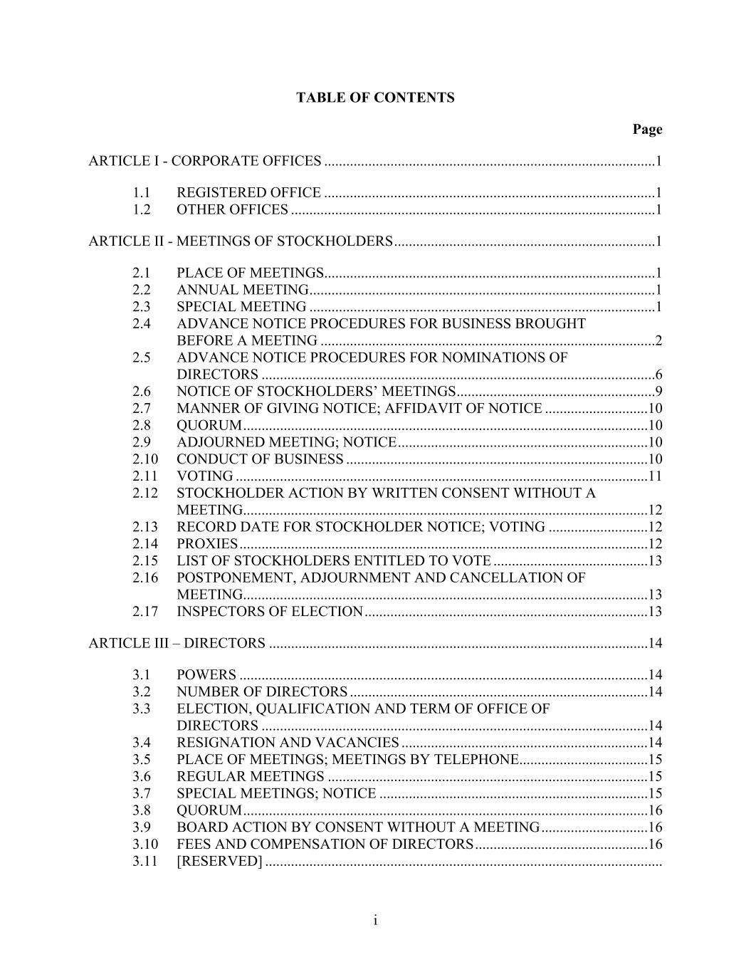 i TABLE OF CONTENTS Page ARTICLE I - CORPORATE OFFICES ..........................................................................................1 1.1 REGISTERED OFFICE ..........................................................................................1 1.2 OTHER OFFICES ...................................................................................................1 ARTICLE II - MEETINGS OF STOCKHOLDERS .......................................................................1 2.1 PLACE OF MEETINGS..........................................................................................1 2.2 ANNUAL MEETING ..............................................................................................1 2.3 SPECIAL MEETING ..............................................................................................1 2.4 ADVANCE NOTICE PROCEDURES FOR BUSINESS BROUGHT BEFORE A MEETING ...........................................................................................2 2.5 ADVANCE NOTICE PROCEDURES FOR NOMINATIONS OF DIRECTORS ...........................................................................................................6 2.6 NOTICE OF STOCKHOLDERS’ MEETINGS ......................................................9 2.7 MANNER OF GIVING NOTICE; AFFIDAVIT OF NOTICE ............................10 2.8 QUORUM ..............................................................................................................10 2.9 ADJOURNED MEETING; NOTICE ....................................................................10 2.10 CONDUCT OF BUSINESS ..................................................................................10 2.11 VOTING ................................................................................................................11 2.12 STOCKHOLDER ACTION BY WRITTEN CONSENT WITHOUT A MEETING..............................................................................................................12 2.13 RECORD DATE FOR STOCKHOLDER NOTICE; VOTING ...........................12 2.14 PROXIES ...............................................................................................................12 2.15 LIST OF STOCKHOLDERS ENTITLED TO VOTE ..........................................13 2.16 POSTPONEMENT, ADJOURNMENT AND CANCELLATION OF MEETING..............................................................................................................13 2.17 INSPECTORS OF ELECTION .............................................................................13 ARTICLE III – DIRECTORS .......................................................................................................14 3.1 POWERS ...............................................................................................................14 3.2 NUMBER OF DIRECTORS .................................................................................14 3.3 ELECTION, QUALIFICATION AND TERM OF OFFICE OF DIRECTORS .........................................................................................................14 3.4 RESIGNATION AND VACANCIES ...................................................................14 3.5 PLACE OF MEETINGS; MEETINGS BY TELEPHONE...................................15 3.6 REGULAR MEETINGS .......................................................................................15 3.7 SPECIAL MEETINGS; NOTICE .........................................................................15 3.8 QUORUM ..............................................................................................................16 3.9 BOARD ACTION BY CONSENT WITHOUT A MEETING .............................16 3.10 FEES AND COMPENSATION OF DIRECTORS ...............................................16 3.11 [RESERVED] ............................................................................................................
