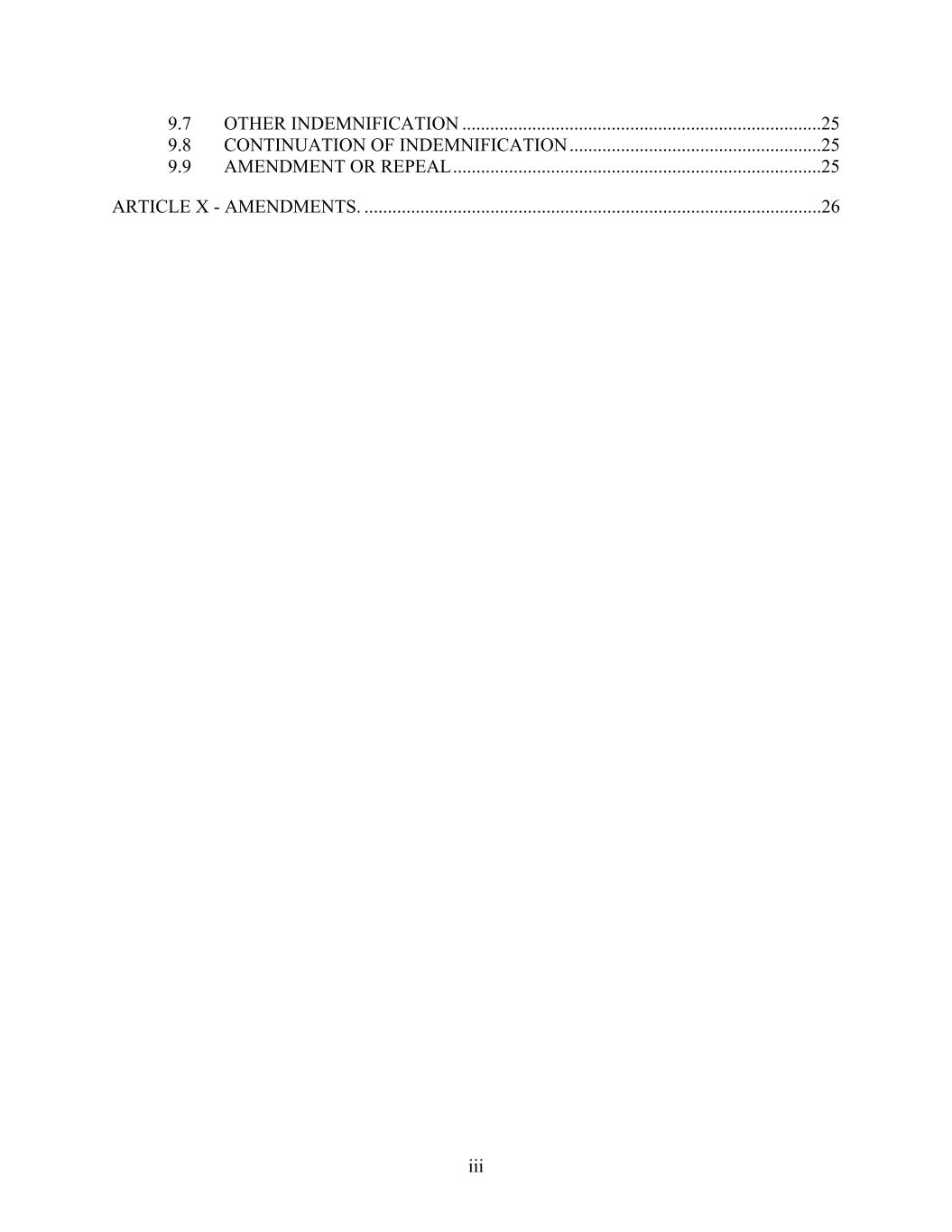 iii 9.7 OTHER INDEMNIFICATION .............................................................................25 9.8 CONTINUATION OF INDEMNIFICATION ......................................................25 9.9 AMENDMENT OR REPEAL ...............................................................................25 ARTICLE X - AMENDMENTS. ..................................................................................................26