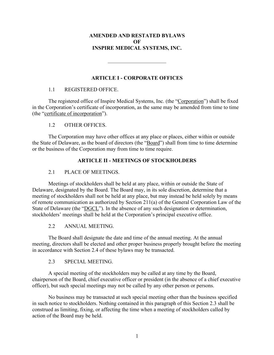 1 AMENDED AND RESTATED BYLAWS OF INSPIRE MEDICAL SYSTEMS, INC. ARTICLE I - CORPORATE OFFICES 1.1 REGISTERED OFFICE. The registered office of Inspire Medical Systems, Inc. (the “Corporation”) shall be fixed in the Corporation’s certificate of incorporation, as the same may be amended from time to time (the “certificate of incorporation”). 1.2 OTHER OFFICES. The Corporation may have other offices at any place or places, either within or outside the State of Delaware, as the board of directors (the “Board”) shall from time to time determine or the business of the Corporation may from time to time require. ARTICLE II - MEETINGS OF STOCKHOLDERS 2.1 PLACE OF MEETINGS. Meetings of stockholders shall be held at any place, within or outside the State of Delaware, designated by the Board. The Board may, in its sole discretion, determine that a meeting of stockholders shall not be held at any place, but may instead be held solely by means of remote communication as authorized by Section 211(a) of the General Corporation Law of the State of Delaware (the “DGCL”). In the absence of any such designation or determination, stockholders’ meetings shall be held at the Corporation’s principal executive office. 2.2 ANNUAL MEETING. The Board shall designate the date and time of the annual meeting. At the annual meeting, directors shall be elected and other proper business properly brought before the meeting in accordance with Section 2.4 of these bylaws may be transacted. 2.3 SPECIAL MEETING. A special meeting of the stockholders may be called at any time by the Board, chairperson of the Board, chief executive officer or president (in the absence of a chief executive officer), but such special meetings may not be called by any other person or persons. No business may be transacted at such special meeting other than the business specified in such notice to stockholders. Nothing contained in this paragraph of this Section 2.3 shall be construed as limiting, fixing, or affecting the time when a meeting of stockholders called by action of the Board may be held.