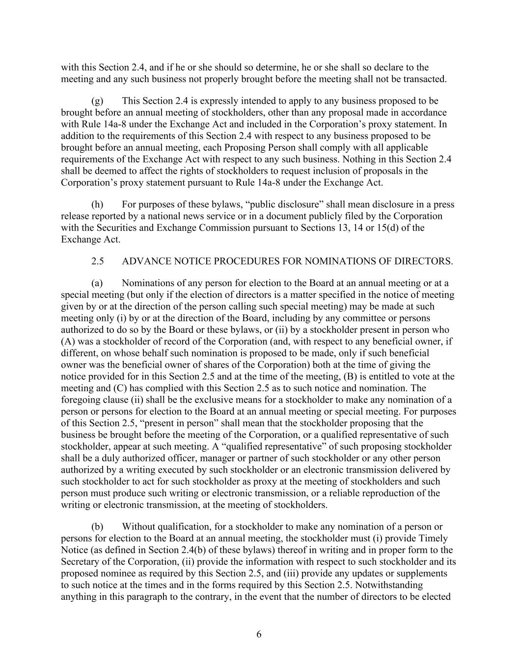 6 with this Section 2.4, and if he or she should so determine, he or she shall so declare to the meeting and any such business not properly brought before the meeting shall not be transacted. (g) This Section 2.4 is expressly intended to apply to any business proposed to be brought before an annual meeting of stockholders, other than any proposal made in accordance with Rule 14a-8 under the Exchange Act and included in the Corporation’s proxy statement. In addition to the requirements of this Section 2.4 with respect to any business proposed to be brought before an annual meeting, each Proposing Person shall comply with all applicable requirements of the Exchange Act with respect to any such business. Nothing in this Section 2.4 shall be deemed to affect the rights of stockholders to request inclusion of proposals in the Corporation’s proxy statement pursuant to Rule 14a-8 under the Exchange Act. (h) For purposes of these bylaws, “public disclosure” shall mean disclosure in a press release reported by a national news service or in a document publicly filed by the Corporation with the Securities and Exchange Commission pursuant to Sections 13, 14 or 15(d) of the Exchange Act. 2.5 ADVANCE NOTICE PROCEDURES FOR NOMINATIONS OF DIRECTORS. (a) Nominations of any person for election to the Board at an annual meeting or at a special meeting (but only if the election of directors is a matter specified in the notice of meeting given by or at the direction of the person calling such special meeting) may be made at such meeting only (i) by or at the direction of the Board, including by any committee or persons authorized to do so by the Board or these bylaws, or (ii) by a stockholder present in person who (A) was a stockholder of record of the Corporation (and, with respect to any beneficial owner, if different, on whose behalf such nomination is proposed to be made, only if such beneficial owner was the beneficial owner of shares of the Corporation) both at the time of giving the notice provided for in this Section 2.5 and at the time of the meeting, (B) is entitled to vote at the meeting and (C) has complied with this Section 2.5 as to such notice and nomination. The foregoing clause (ii) shall be the exclusive means for a stockholder to make any nomination of a person or persons for election to the Board at an annual meeting or special meeting. For purposes of this Section 2.5, “present in person” shall mean that the stockholder proposing that the business be brought before the meeting of the Corporation, or a qualified representative of such stockholder, appear at such meeting. A “qualified representative” of such proposing stockholder shall be a duly authorized officer, manager or partner of such stockholder or any other person authorized by a writing executed by such stockholder or an electronic transmission delivered by such stockholder to act for such stockholder as proxy at the meeting of stockholders and such person must produce such writing or electronic transmission, or a reliable reproduction of the writing or electronic transmission, at the meeting of stockholders. (b) Without qualification, for a stockholder to make any nomination of a person or persons for election to the Board at an annual meeting, the stockholder must (i) provide Timely Notice (as defined in Section 2.4(b) of these bylaws) thereof in writing and in proper form to the Secretary of the Corporation, (ii) provide the information with respect to such stockholder and its proposed nominee as required by this Section 2.5, and (iii) provide any updates or supplements to such notice at the times and in the forms required by this Section 2.5. Notwithstanding anything in this paragraph to the contrary, in the event that the number of directors to be elected