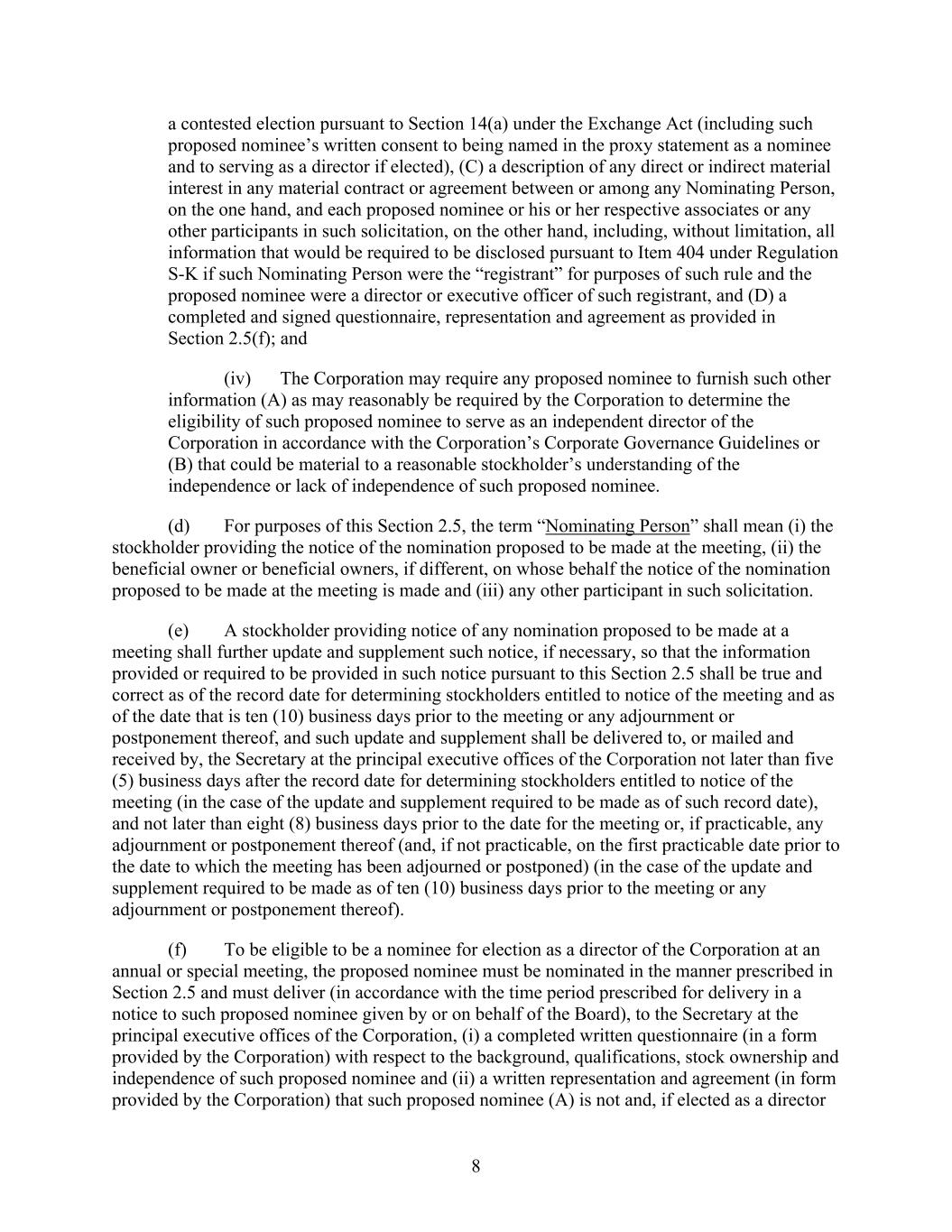8 a contested election pursuant to Section 14(a) under the Exchange Act (including such proposed nominee’s written consent to being named in the proxy statement as a nominee and to serving as a director if elected), (C) a description of any direct or indirect material interest in any material contract or agreement between or among any Nominating Person, on the one hand, and each proposed nominee or his or her respective associates or any other participants in such solicitation, on the other hand, including, without limitation, all information that would be required to be disclosed pursuant to Item 404 under Regulation S-K if such Nominating Person were the “registrant” for purposes of such rule and the proposed nominee were a director or executive officer of such registrant, and (D) a completed and signed questionnaire, representation and agreement as provided in Section 2.5(f); and (iv) The Corporation may require any proposed nominee to furnish such other information (A) as may reasonably be required by the Corporation to determine the eligibility of such proposed nominee to serve as an independent director of the Corporation in accordance with the Corporation’s Corporate Governance Guidelines or (B) that could be material to a reasonable stockholder’s understanding of the independence or lack of independence of such proposed nominee. (d) For purposes of this Section 2.5, the term “Nominating Person” shall mean (i) the stockholder providing the notice of the nomination proposed to be made at the meeting, (ii) the beneficial owner or beneficial owners, if different, on whose behalf the notice of the nomination proposed to be made at the meeting is made and (iii) any other participant in such solicitation. (e) A stockholder providing notice of any nomination proposed to be made at a meeting shall further update and supplement such notice, if necessary, so that the information provided or required to be provided in such notice pursuant to this Section 2.5 shall be true and correct as of the record date for determining stockholders entitled to notice of the meeting and as of the date that is ten (10) business days prior to the meeting or any adjournment or postponement thereof, and such update and supplement shall be delivered to, or mailed and received by, the Secretary at the principal executive offices of the Corporation not later than five (5) business days after the record date for determining stockholders entitled to notice of the meeting (in the case of the update and supplement required to be made as of such record date), and not later than eight (8) business days prior to the date for the meeting or, if practicable, any adjournment or postponement thereof (and, if not practicable, on the first practicable date prior to the date to which the meeting has been adjourned or postponed) (in the case of the update and supplement required to be made as of ten (10) business days prior to the meeting or any adjournment or postponement thereof). (f) To be eligible to be a nominee for election as a director of the Corporation at an annual or special meeting, the proposed nominee must be nominated in the manner prescribed in Section 2.5 and must deliver (in accordance with the time period prescribed for delivery in a notice to such proposed nominee given by or on behalf of the Board), to the Secretary at the principal executive offices of the Corporation, (i) a completed written questionnaire (in a form provided by the Corporation) with respect to the background, qualifications, stock ownership and independence of such proposed nominee and (ii) a written representation and agreement (in form provided by the Corporation) that such proposed nominee (A) is not and, if elected as a director