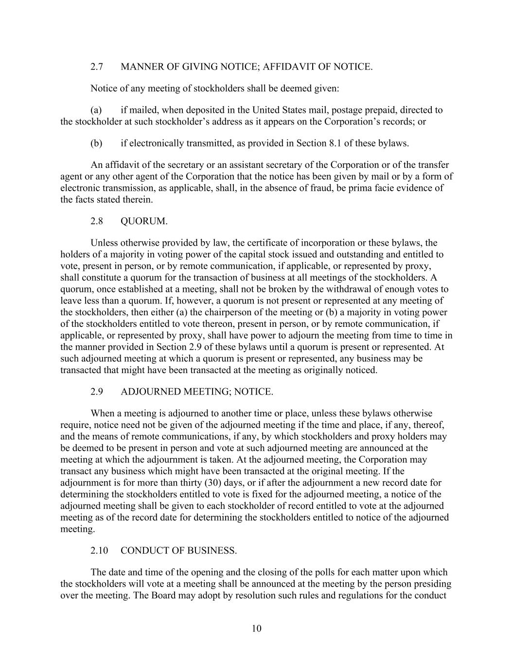 10 2.7 MANNER OF GIVING NOTICE; AFFIDAVIT OF NOTICE. Notice of any meeting of stockholders shall be deemed given: (a) if mailed, when deposited in the United States mail, postage prepaid, directed to the stockholder at such stockholder’s address as it appears on the Corporation’s records; or (b) if electronically transmitted, as provided in Section 8.1 of these bylaws. An affidavit of the secretary or an assistant secretary of the Corporation or of the transfer agent or any other agent of the Corporation that the notice has been given by mail or by a form of electronic transmission, as applicable, shall, in the absence of fraud, be prima facie evidence of the facts stated therein. 2.8 QUORUM. Unless otherwise provided by law, the certificate of incorporation or these bylaws, the holders of a majority in voting power of the capital stock issued and outstanding and entitled to vote, present in person, or by remote communication, if applicable, or represented by proxy, shall constitute a quorum for the transaction of business at all meetings of the stockholders. A quorum, once established at a meeting, shall not be broken by the withdrawal of enough votes to leave less than a quorum. If, however, a quorum is not present or represented at any meeting of the stockholders, then either (a) the chairperson of the meeting or (b) a majority in voting power of the stockholders entitled to vote thereon, present in person, or by remote communication, if applicable, or represented by proxy, shall have power to adjourn the meeting from time to time in the manner provided in Section 2.9 of these bylaws until a quorum is present or represented. At such adjourned meeting at which a quorum is present or represented, any business may be transacted that might have been transacted at the meeting as originally noticed. 2.9 ADJOURNED MEETING; NOTICE. When a meeting is adjourned to another time or place, unless these bylaws otherwise require, notice need not be given of the adjourned meeting if the time and place, if any, thereof, and the means of remote communications, if any, by which stockholders and proxy holders may be deemed to be present in person and vote at such adjourned meeting are announced at the meeting at which the adjournment is taken. At the adjourned meeting, the Corporation may transact any business which might have been transacted at the original meeting. If the adjournment is for more than thirty (30) days, or if after the adjournment a new record date for determining the stockholders entitled to vote is fixed for the adjourned meeting, a notice of the adjourned meeting shall be given to each stockholder of record entitled to vote at the adjourned meeting as of the record date for determining the stockholders entitled to notice of the adjourned meeting. 2.10 CONDUCT OF BUSINESS. The date and time of the opening and the closing of the polls for each matter upon which the stockholders will vote at a meeting shall be announced at the meeting by the person presiding over the meeting. The Board may adopt by resolution such rules and regulations for the conduct